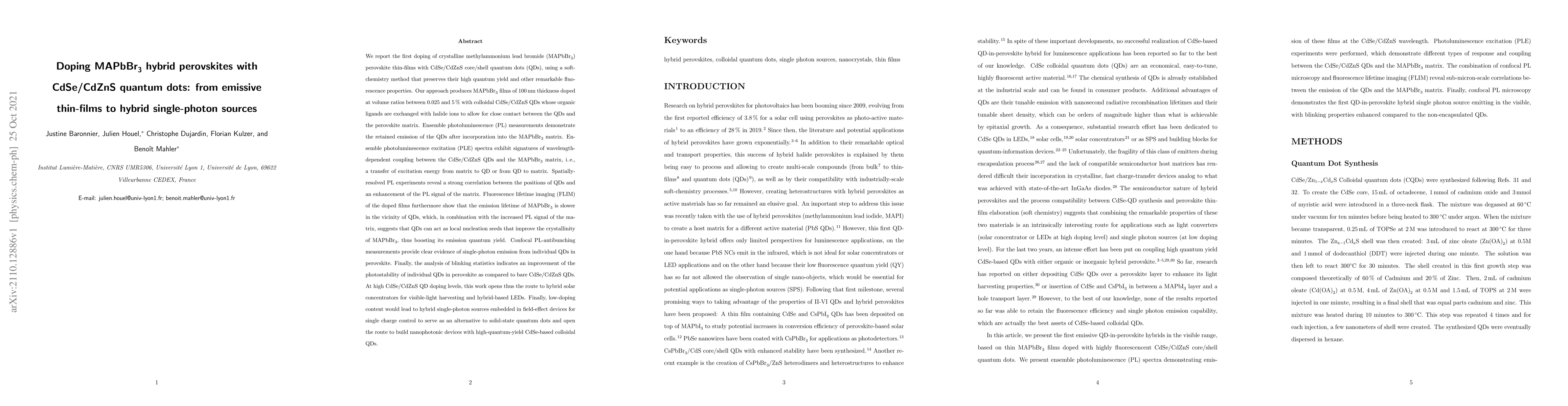 This paper reports the doping of MAPbBr$_3$ perovskite thin-films with CdSe/CdZnS quantum dots, demonstrating enhanced emission and crystallinity through quantum dot nucleation. The study shows single-photon emission and improved photostability, paving the way for hybrid LEDs and single-photon sources.