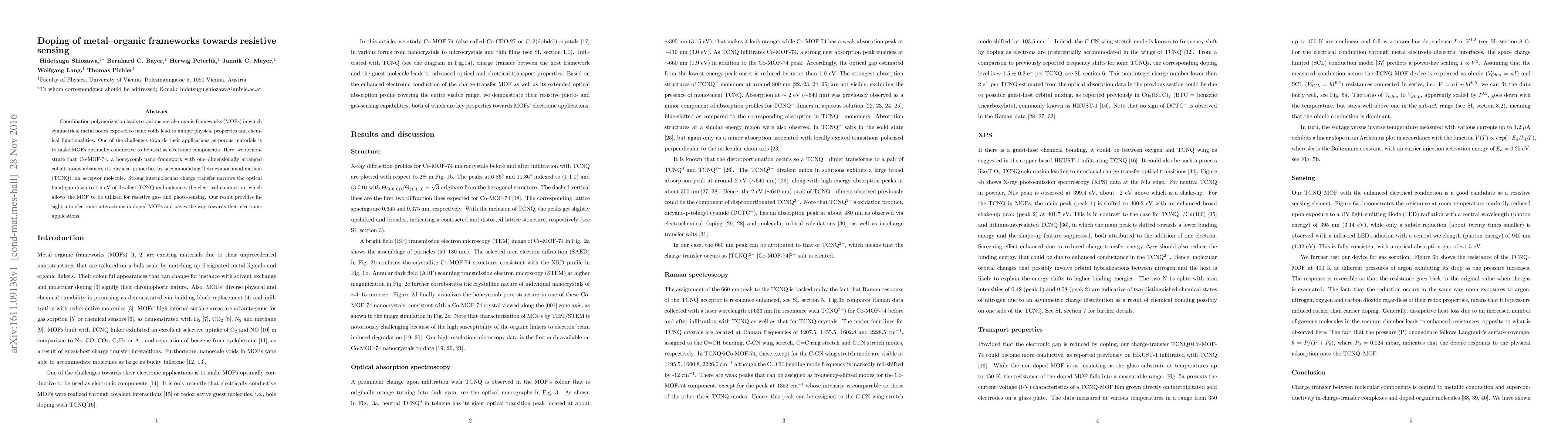 This paper explores the doping of Co-MOF-74 with Tetracyanochinodimethan (TCNQ) to enhance its electrical conductivity through strong intermolecular charge transfer, narrowing its optical band gap and enabling resistive sensing applications for gases and light. The study sheds light on electronic interactions in doped metal-organic frameworks, opening new pathways for their electronic use.