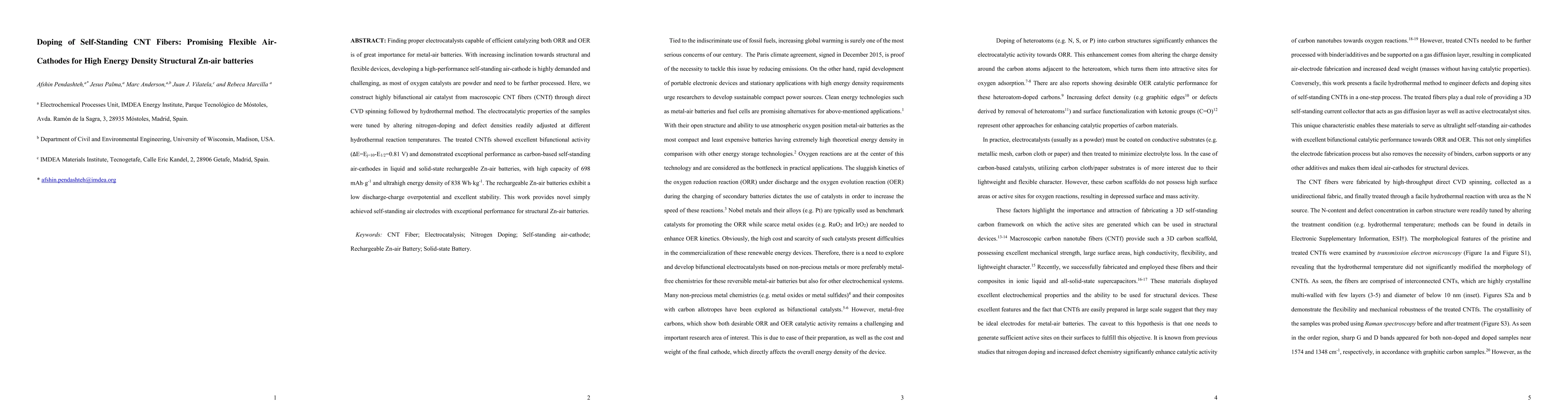 This paper presents a method for creating highly bifunctional nitrogen-doped carbon nanotube fiber air-cathodes via CVD spinning and hydrothermal treatment, demonstrating excellent performance in both liquid and solid-state rechargeable Zn-air batteries with high energy density and stability. The optimized fibers show promising potential for flexible, high-capacity structural Zn-air batteries.