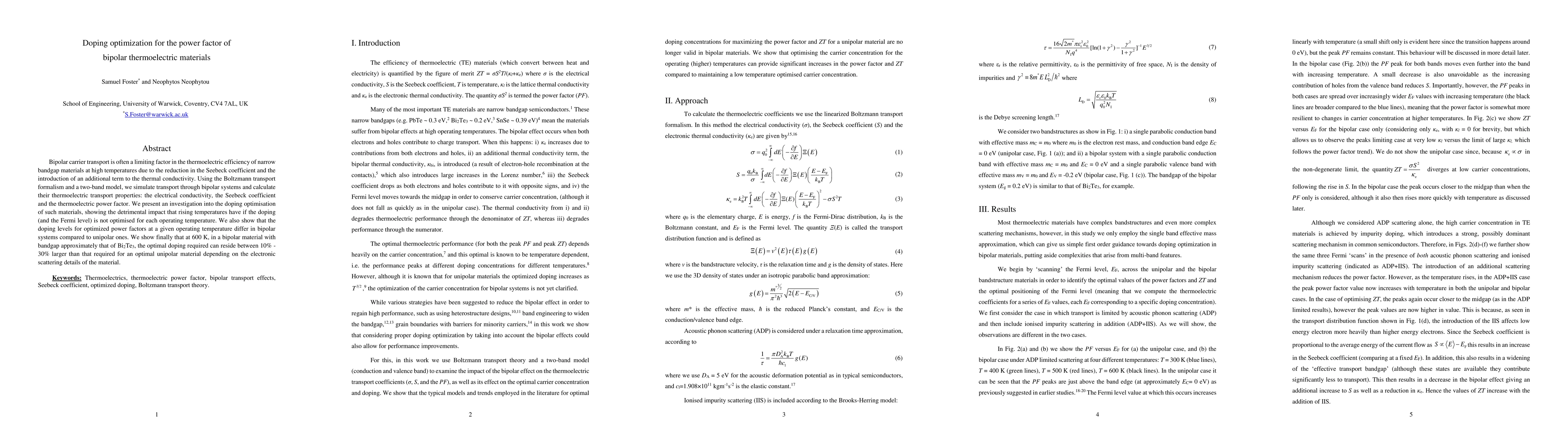 This paper investigates the doping optimization for bipolar thermoelectric materials to enhance their power factor, revealing that rising temperatures significantly impact efficiency if doping is not tailored for each operating temperature. The study finds that optimal doping levels for bipolar systems differ from unipolar ones, with a 10%-30% higher doping required for optimal performance at 600 K compared to unipolar materials.