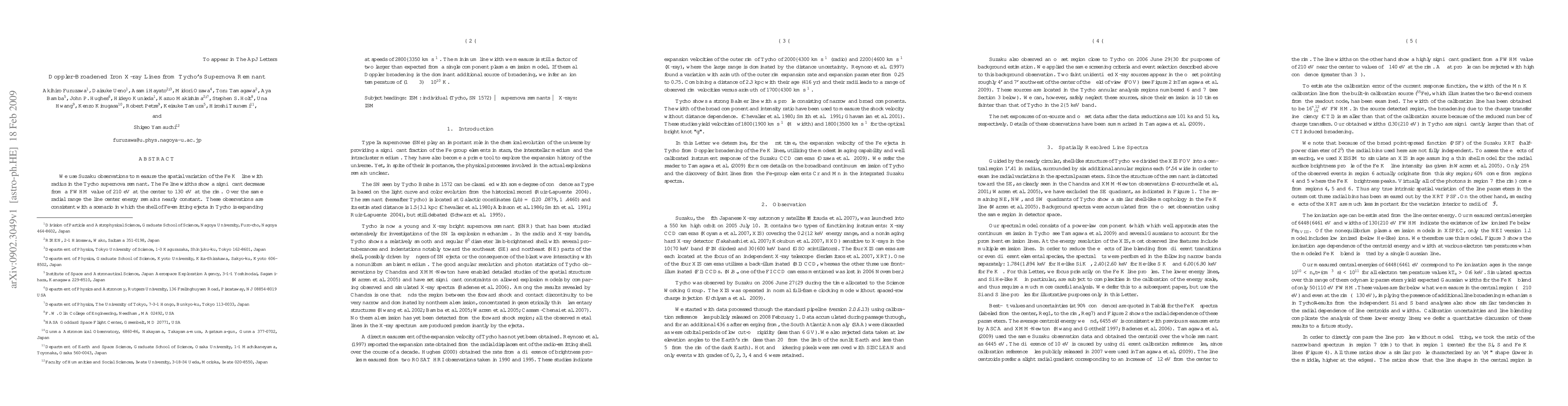 The study measures Doppler broadening of Fe X-ray lines in Tycho's supernova remnant, finding a significant decrease in line width from center to rim, consistent with expansion speeds of 2800-3350 km/s. The minimum line width exceeds expectations, suggesting an ion temperature of (1-3) ω10 K.