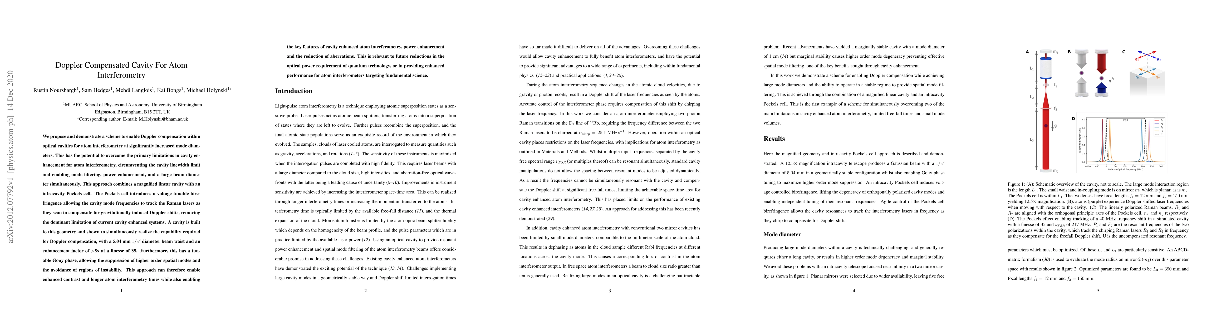 We propose and demonstrate a scheme to enable Doppler compensation within optical cavities for atom interferometry at significantly increased mode diameters. This has the potential to overcome the primary limitations in cavity enhancement for atom interferometry, circumventing the cavity linewidth limit and enabling mode filtering, power enhancement, and a large beam diameter simultaneously. This approach combines a magnified linear cavity with an intracavity Pockels cell. The Pockels cell introduces a voltage tunable birefringence allowing the cavity mode frequencies to track the Raman lasers as they scan to compensate for gravitationally induced Doppler shifts, removing the dominant limitation of current cavity enhanced systems. A cavity is built to this geometry and shown to simultaneously realize the capability required for Doppler compensation, with a 5.04~mm $1/e^{2}$ diameter beam waist and an enhancement factor of $>$5x at a finesse of 35. Furthermore, this has a tunable Gouy phase, allowing the suppression of higher order spatial modes and the avoidance of regions of instability. This approach can therefore enable enhanced contrast and longer atom interferometry times while also enabling the key features of cavity enhanced atom interferometry, power enhancement and the reduction of aberrations. This is relevant to future reductions in the optical power requirement of quantum technology, or in providing enhanced performance for atom interferometers targeting fundamental science.