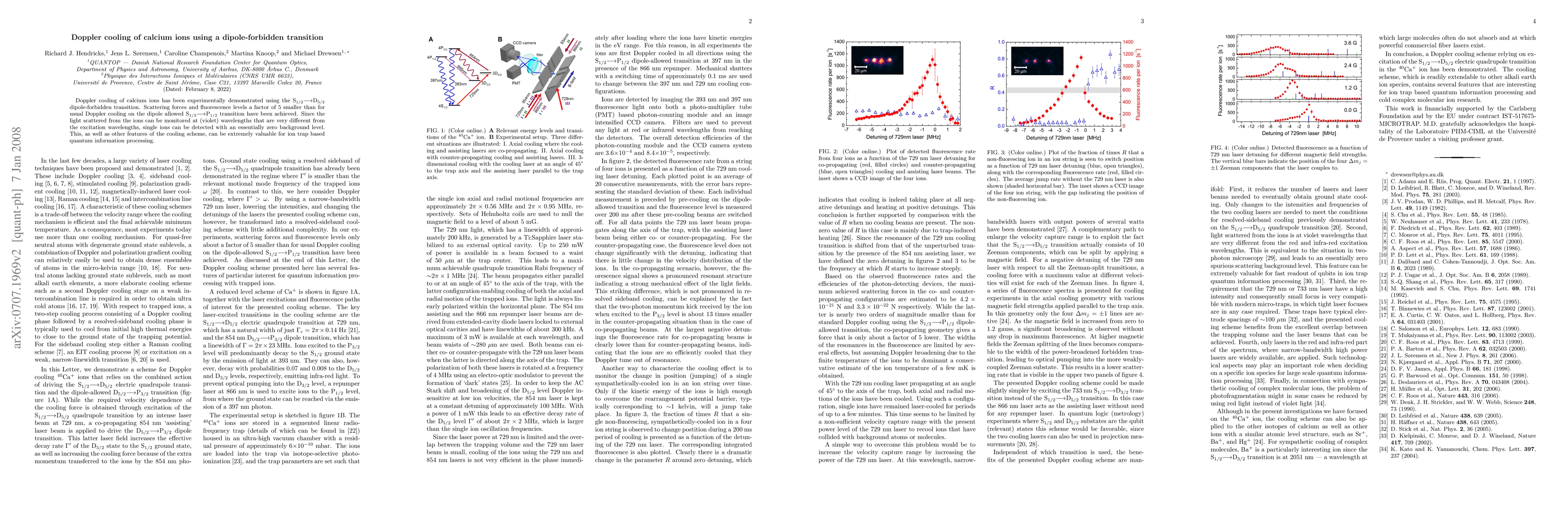 This paper demonstrates Doppler cooling of calcium ions via a dipole-forbidden transition, achieving scattering forces and fluorescence levels five times lower than typical dipole-allowed transitions. The method allows for single ion detection with minimal background, enhancing potential for quantum information processing in ion traps.