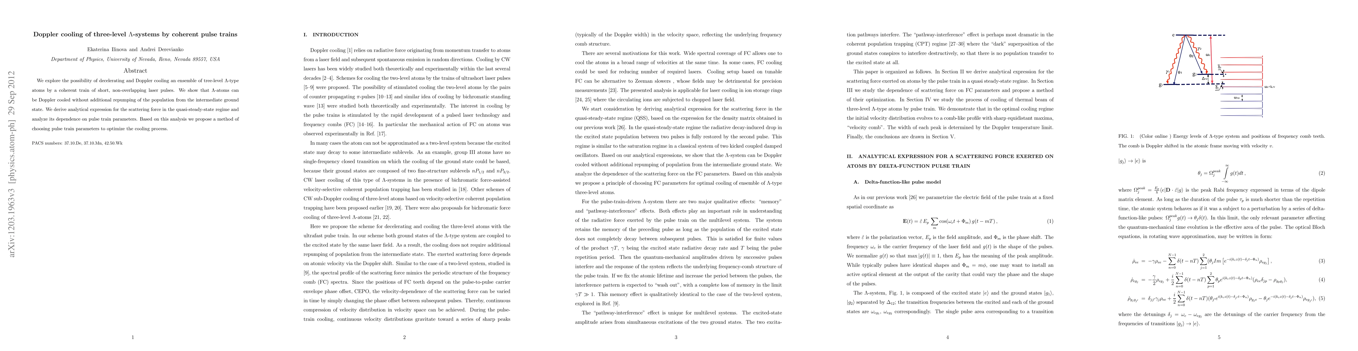 This paper investigates the Doppler cooling of three-level $\Lambda$-systems using a coherent train of short laser pulses, demonstrating that cooling can occur without additional repumping. Analytical expressions for the scattering force are derived, and an optimized method for selecting pulse train parameters to enhance cooling efficiency is proposed.