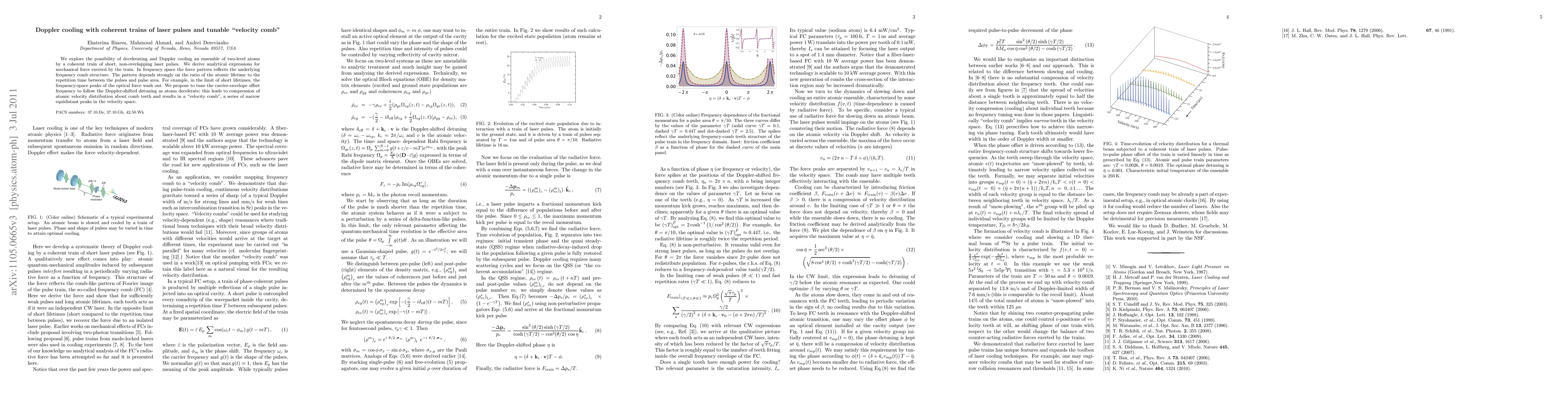 Summary: This paper investigates Doppler cooling using coherent laser pulse trains, developing an analytical model that reveals the resulting "velocity comb" structure in velocity space. The effective scattering force mirrors the frequency comb, with force patterns strongly influenced by atomic lifetime and pulse repetition time.
