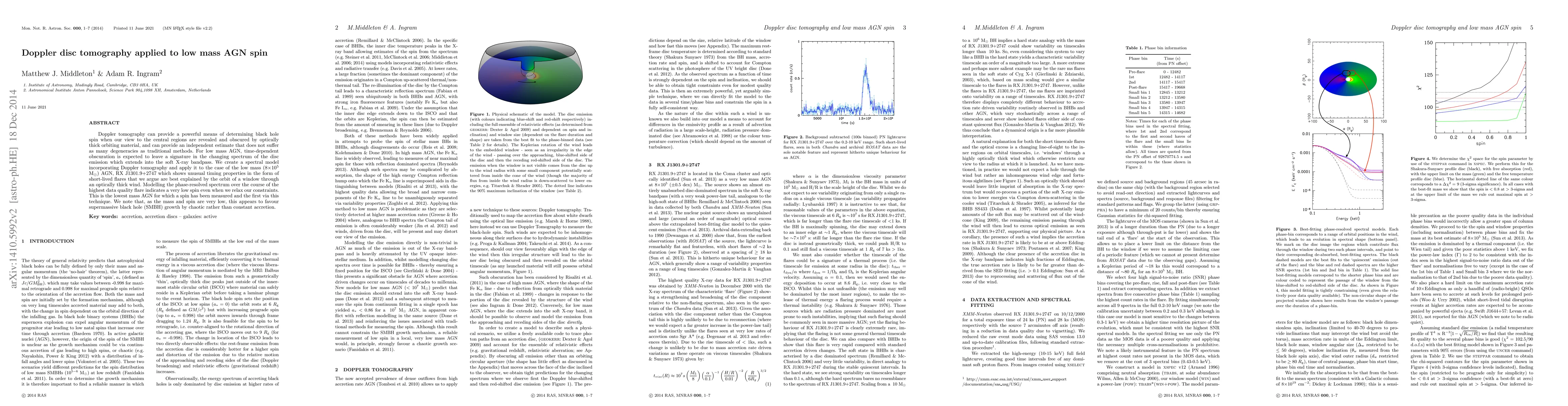 Doppler tomography can provide a powerful means of determining black hole spin when our view to the central regions are revealed and obscured by optically thick orbiting material, and can provide an independent estimate that does not suffer as many degeneracies as traditional methods. For low mass AGN, time-dependent obscuration is expected to leave a signature in the changing spectrum of the disc emission which extends into the soft X-ray bandpass. We create a spectral model incorporating Doppler tomography and apply it to the case of the low mass (8 $\times$ 10$^{5}$ M$_{\odot}$) AGN, RX J1301.9+2747 which shows unusual timing properties in the form of short-lived flares that we argue are best explained by the orbit of a window through an optically thick wind. Modelling the phase-resolved spectrum over the course of the highest data quality flare indicates a very low spin even when we relax our constraints. This is the lowest mass AGN for which a spin has been measured and the first via this technique. We note that, as the mass and spin are very low, this appears to favour supermassive black hole (SMBH) growth by chaotic rather than constant accretion.