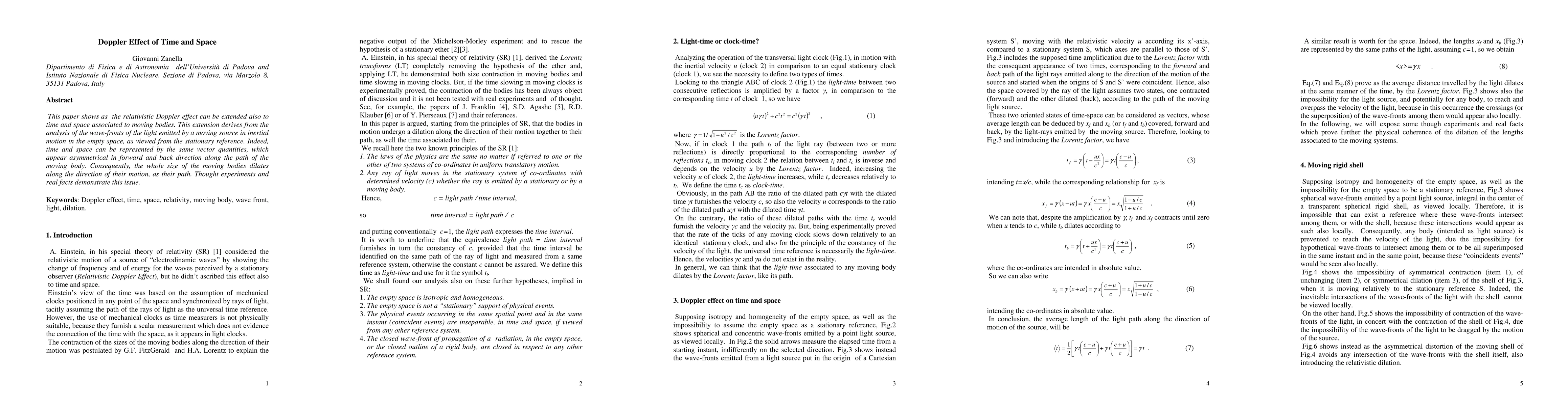 This paper shows as the relativistic Doppler effect can be extended also to time and space associated to moving bodies. This extension derives from the analysis of the wave-fronts of the light emitted by a moving source in inertial motion in the empty space, as viewed from the stationary reference. Indeed, time and space can be represented by the same vector quantities, which appear asymmetrical in forward and back direction along the path of the moving body. Consequently, the whole size of the moving bodies dilates along the direction of their motion, as their path. Thought experiments and real facts demonstrate this issue.