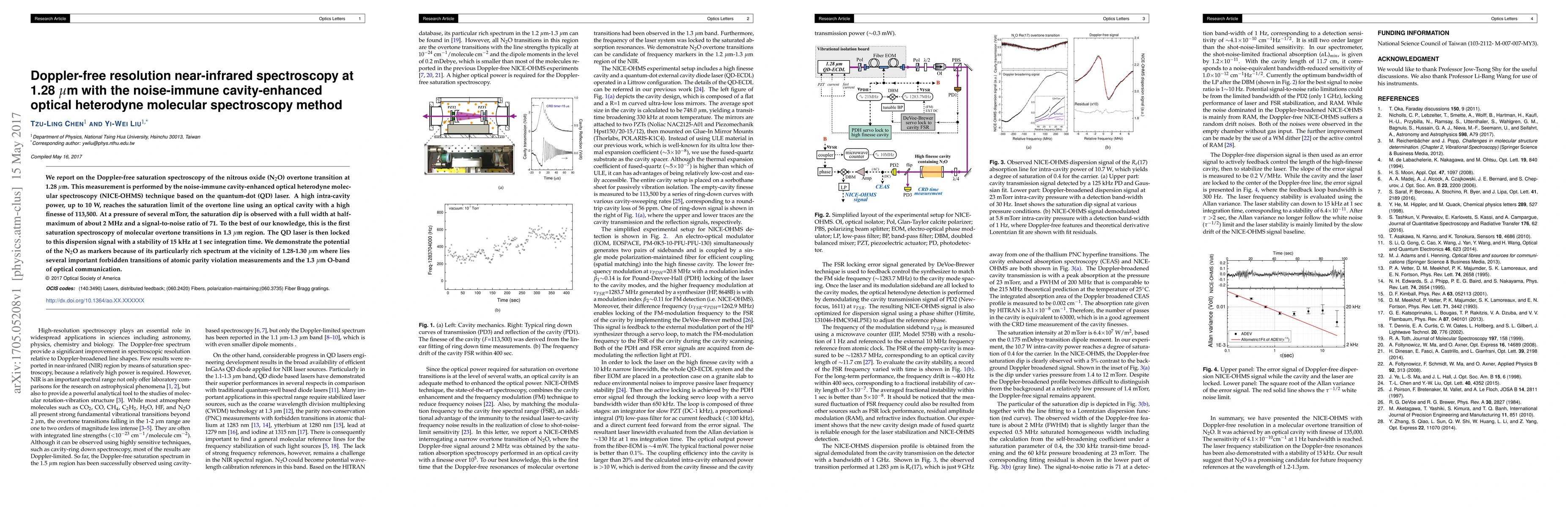 This paper presents Doppler-free saturation spectroscopy of nitrous oxide (N$_2$O) overtone transitions at 1.28~$\mu$m using the NICE-OHMS technique with a quantum-dot laser, achieving a high signal-to-noise ratio and demonstrating the potential of N$_2$O as a marker for forbidden transitions and optical communication.