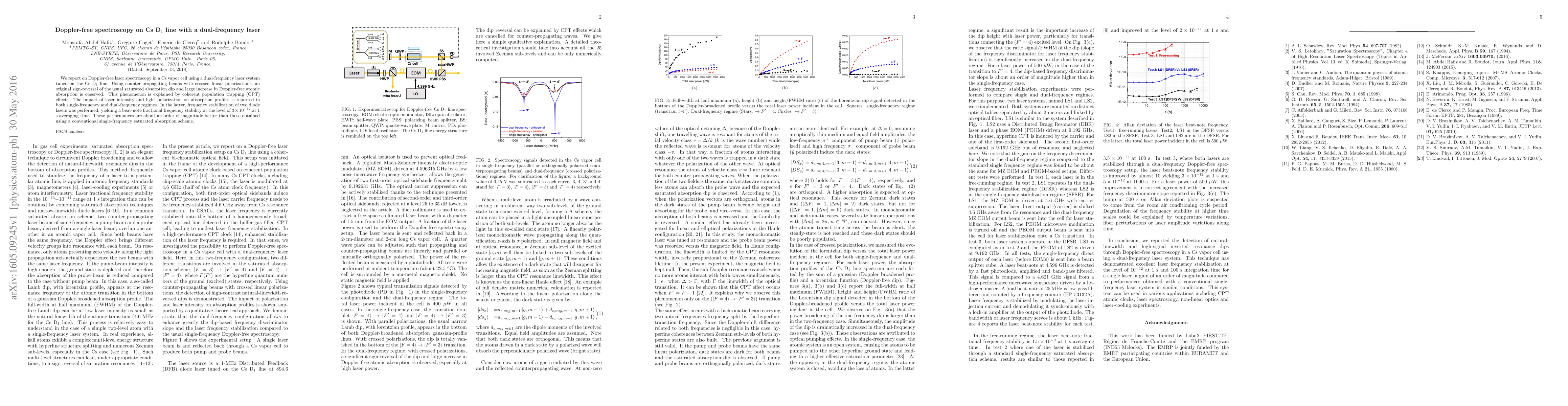 This paper details Doppler-free spectroscopy on the Cs D$_1$ line using a dual-frequency laser, observing a sign-reversal in saturated absorption due to coherent population trapping. The dual-frequency system achieves significantly improved stability and absorption compared to single-frequency methods.
