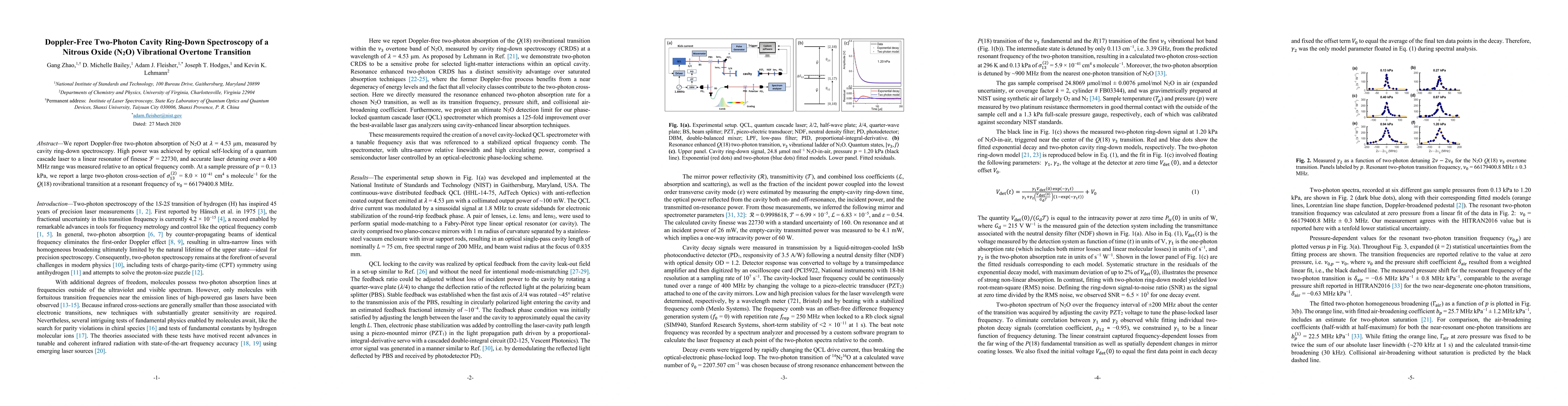 This paper presents Doppler-free two-photon absorption measurements of nitrous oxide (N$_2$O) at 4.53 µm using cavity ring-down spectroscopy, achieving high power through optical self-locking of a quantum cascade laser. The study reports a large two-photon cross-section for the $Q$(18) rovibrational transition at a resonant frequency of 66179400.8 MHz.