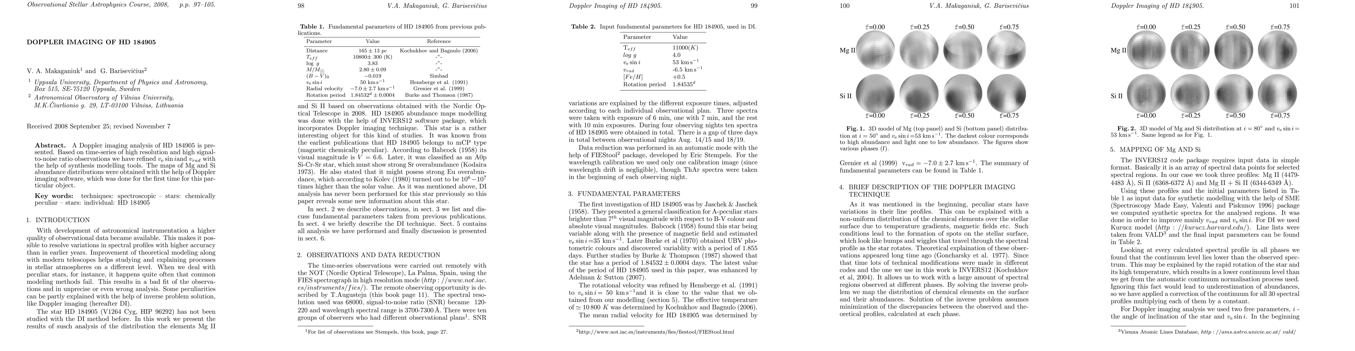 A Doppler imaging analysis of HD 184905 is pre-sented. Based on time series of high resolution and high signal-to-noise ratio observations we have refined vsini and v_rad with the help of synthesis modelling tools. The maps of Mg and Si abundance distributions were obtained with the help of Doppler imaging software, which was done for the first time for this particular object.
