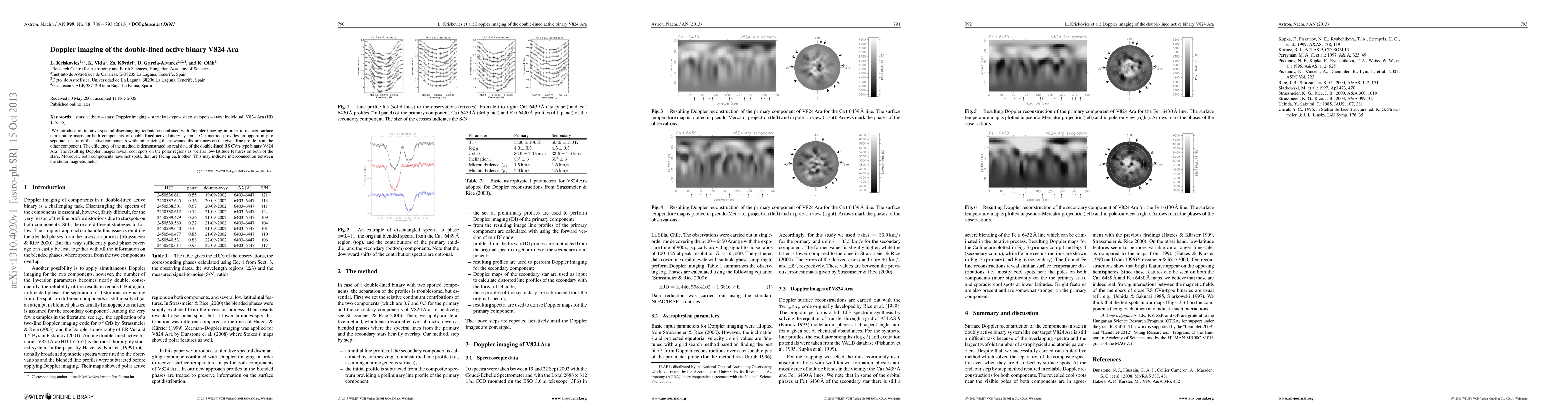This paper presents a new iterative spectral disentangling technique combined with Doppler imaging to recover temperature maps for both stars in the active binary V824 Ara. The method reveals cool spots and hot regions on both stars, suggesting an interconnection between their magnetic fields.