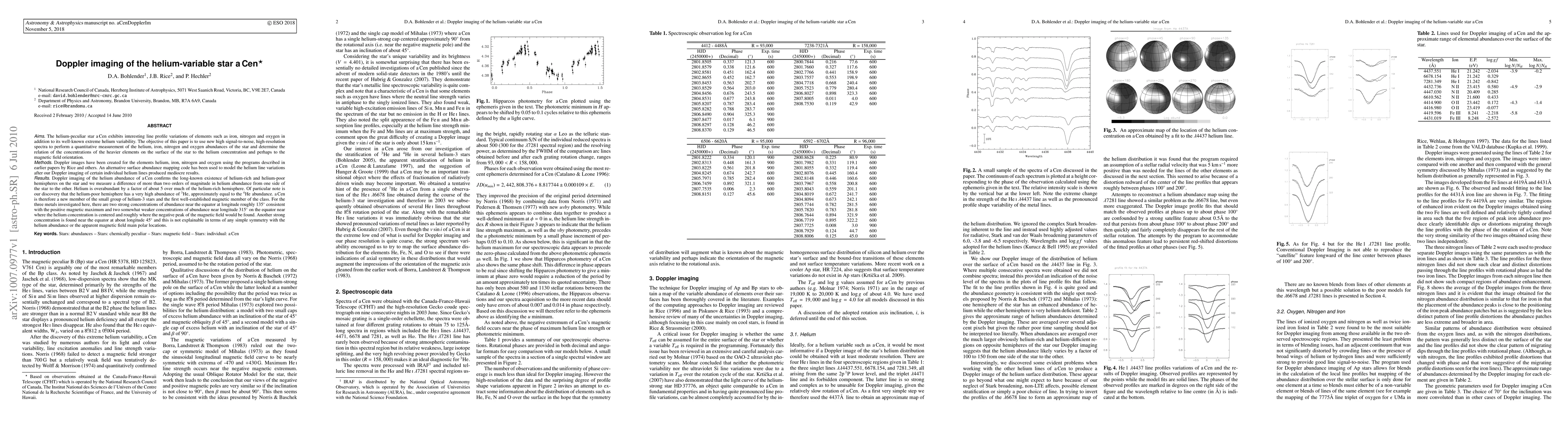 This study uses Doppler imaging to analyze the helium-variable star a Cen, revealing extreme helium variability and significant helium-3 abundance in the helium-poor hemisphere. The research confirms the presence of helium-rich and helium-poor hemispheres with a two-order-of-magnitude difference in helium abundance, and identifies complex spatial distributions of heavier elements correlated with the star's magnetic field orientation.