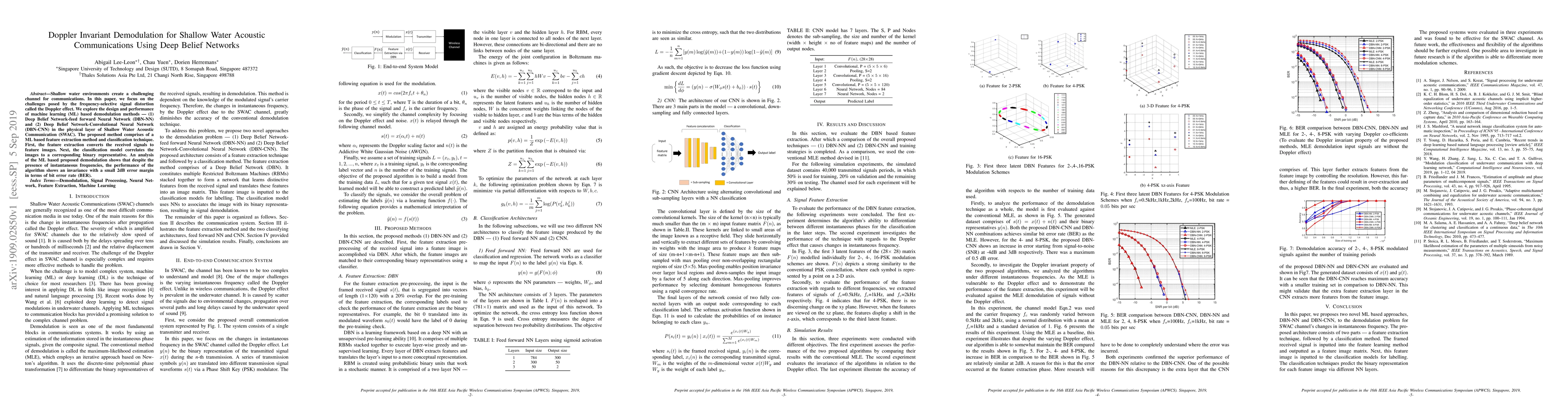 This paper investigates the use of Deep Belief Networks combined with feed-forward and convolutional neural networks for Doppler invariant demodulation in shallow water acoustic communications. The proposed machine learning methods achieve a 2dB error margin in bit error rate, demonstrating effective performance despite frequency-selective distortions.