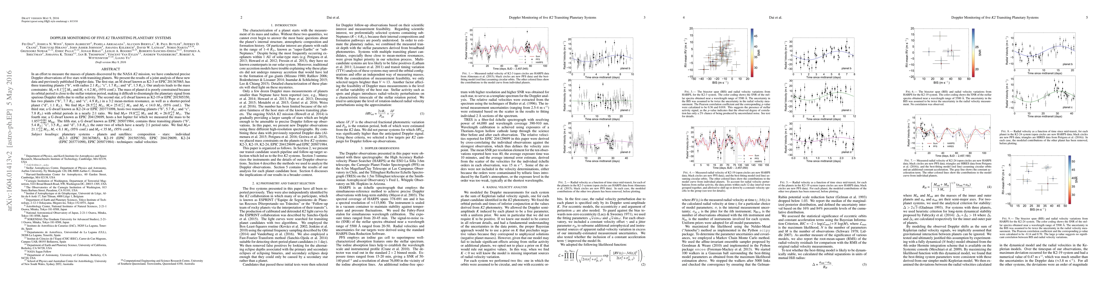 In an effort to measure the masses of planets discovered by the NASA {\it K2} mission, we have conducted precise Doppler observations of five stars with transiting planets. We present the results of a joint analysis of these new data and previously published Doppler data. The first star, an M dwarf known as K2-3 or EPIC~201367065, has three transiting planets ("b", with radius $2.1~R_{\oplus}$; "c", $1.7~R_{\oplus}$; and "d", $1.5~R_{\oplus}$). Our analysis leads to the mass constraints: $M_{b}=8.1^{+2.0}_{-1.9}~M_{\oplus}$ and $M_{c}$ < $ 4.2~M_{\oplus}$~(95\%~conf.). The mass of planet d is poorly constrained because its orbital period is close to the stellar rotation period, making it difficult to disentangle the planetary signal from spurious Doppler shifts due to stellar activity. The second star, a G dwarf known as K2-19 or EPIC~201505350, has two planets ("b", $7.7~R_{\oplus}$; and "c", $4.9~R_{\oplus}$) in a 3:2 mean-motion resonance, as well as a shorter-period planet ("d", $1.1~R_{\oplus}$). We find $M_{b}$= $28.5^{+5.4}_{-5.0} ~M_{\oplus}$, $M_{c}$= $25.6^{+7.1}_{-7.1} ~M_{\oplus}$ and $M_{d}$ < $14.0~M_{\oplus} $~(95\%~conf.). The third star, a G dwarf known as K2-24 or EPIC~203771098, hosts two transiting planets ("b", $5.7~R_{\oplus}$; and "c", $7.8~R_{\oplus}$) with orbital periods in a nearly 2:1 ratio. We find $M_{b}$= $19.8^{+4.5}_{-4.4} ~M_{\oplus}$ and $M_{c}$ = $26.0^{+5.8}_{-6.1}~M_{\oplus}$.....