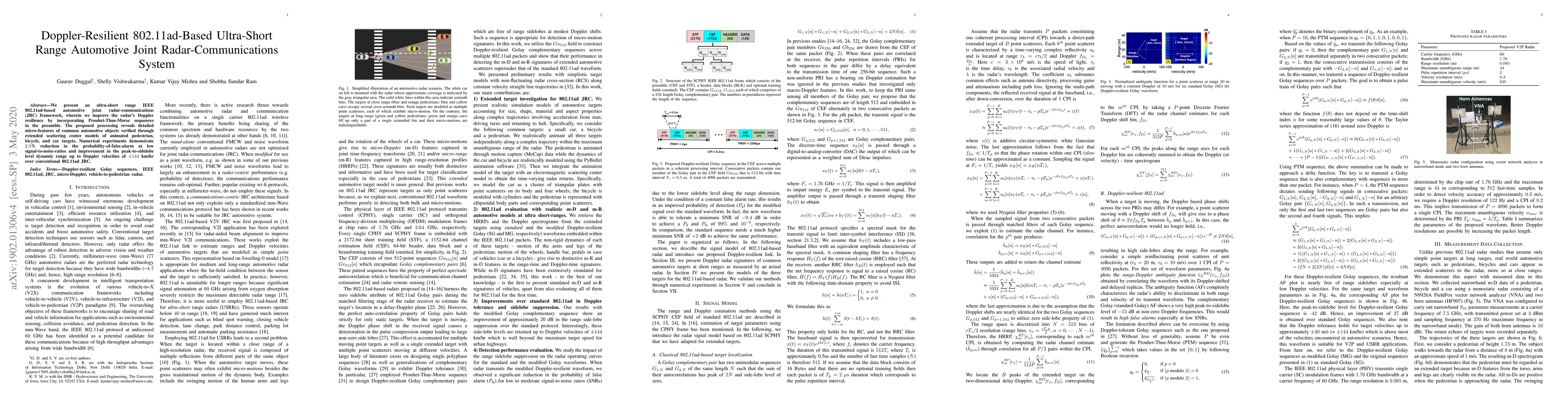 The research presents an ultra-short range IEEE 802.11ad-based automotive joint radar-communications (JRC) framework, enhancing radar's Doppler resilience using Prouhet-Thue-Morse sequences in the preamble. Numerical experiments validate the improvements.