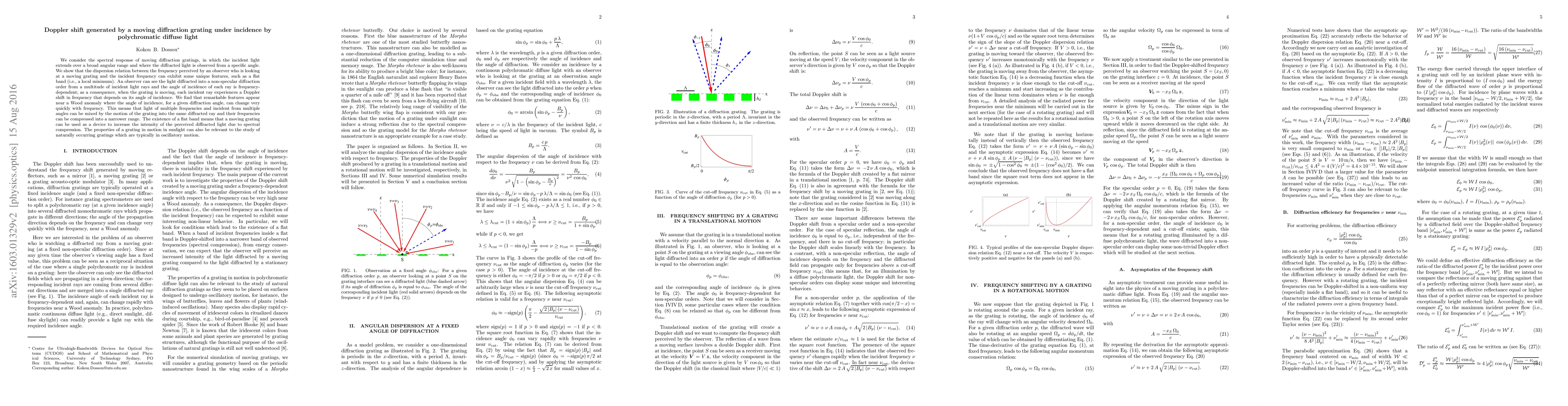 This paper investigates the spectral response of moving diffraction gratings under polychromatic diffuse light, revealing unique features such as a flat band in the dispersion relation. The study finds that the Doppler shift experienced by different incident rays can lead to spectral compression, enhancing the intensity of diffracted light and potentially increasing the relevance of naturally occurring gratings in oscillatory motion.