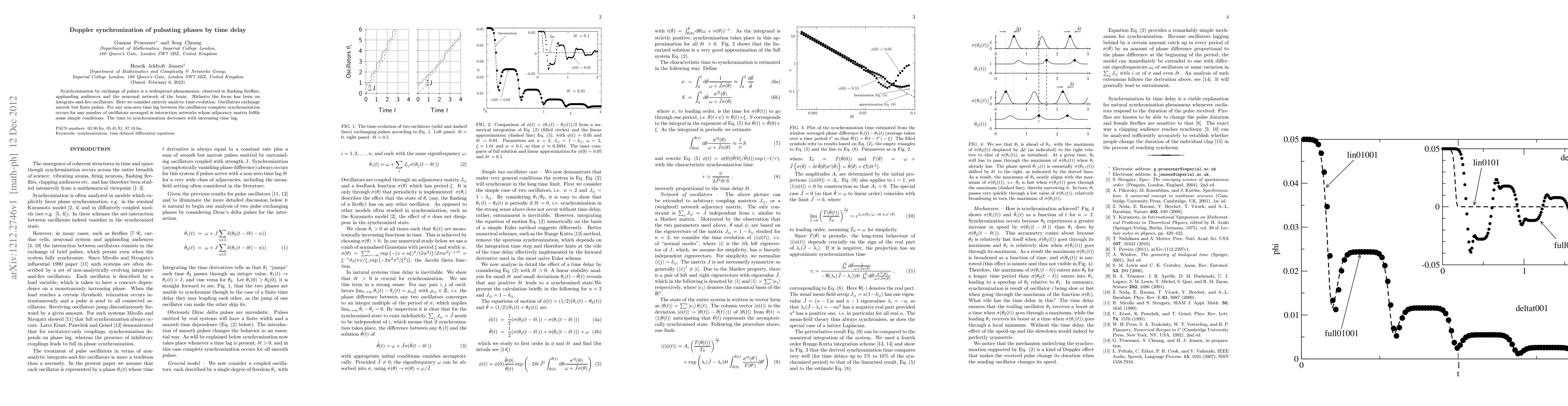Synchronization by exchange of pulses is a widespread phenomenon, observed in flashing fireflies, applauding audiences and the neuronal network of the brain. Hitherto the focus has been on integrate-and-fire oscillators. Here we consider entirely analytic time evolution. Oscillators exchange narrow but finite pulses. For any non-zero time lag between the oscillators complete synchronization occurs for any number of oscillators arranged in interaction networks whose adjacency matrix fulfils some simple conditions. The time to synchronization decreases with increasing time lag.