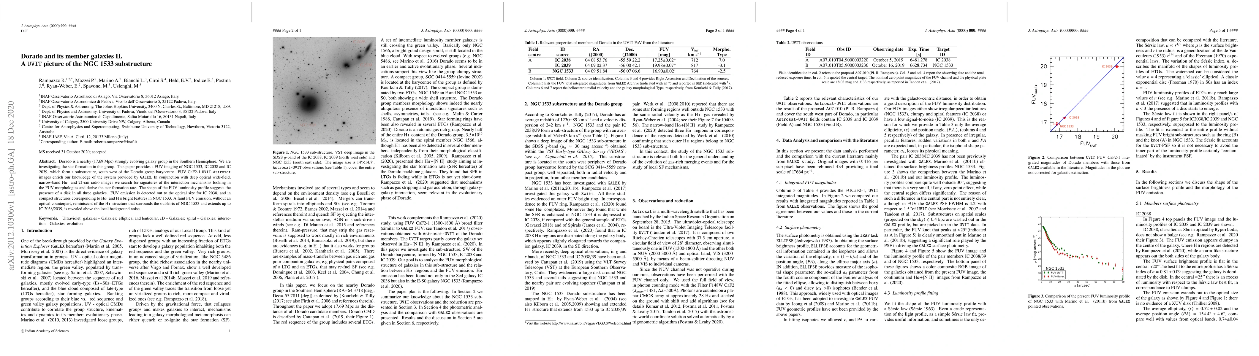 Dorado is a nearby (17.69 Mpc) strongly evolving galaxy group in the Southern Hemisphere. We are investigating the star formation in this group. This paper provides a FUV imaging of NGC 1533, IC 2038 and IC 2039, which form a substructure, south west of the Dorado group barycentre. FUV CaF2-1 UVIT-Astrosat images enrich our knowledge of the system provided by GALEX. In conjunction with deep optical wide-field, narrow-band Halpha and 21-cm radio images we search for signatures of the interaction mechanisms looking in the FUV morphologies and derive the star formation rate. The shape of the FUV luminosity profile suggests the presence of a disk in all three galaxies. FUV emission is detected out to the optical size for IC 2038, and in compact structures corresponding to Halpha and HII bright features in NGC 1533. A faint FUV emission, without an optical counterpart, reminiscent of the HI structure that surrounds the outskirts of NGC 1533 and extends up to IC 2038/2039, is revealed above the local background noise.