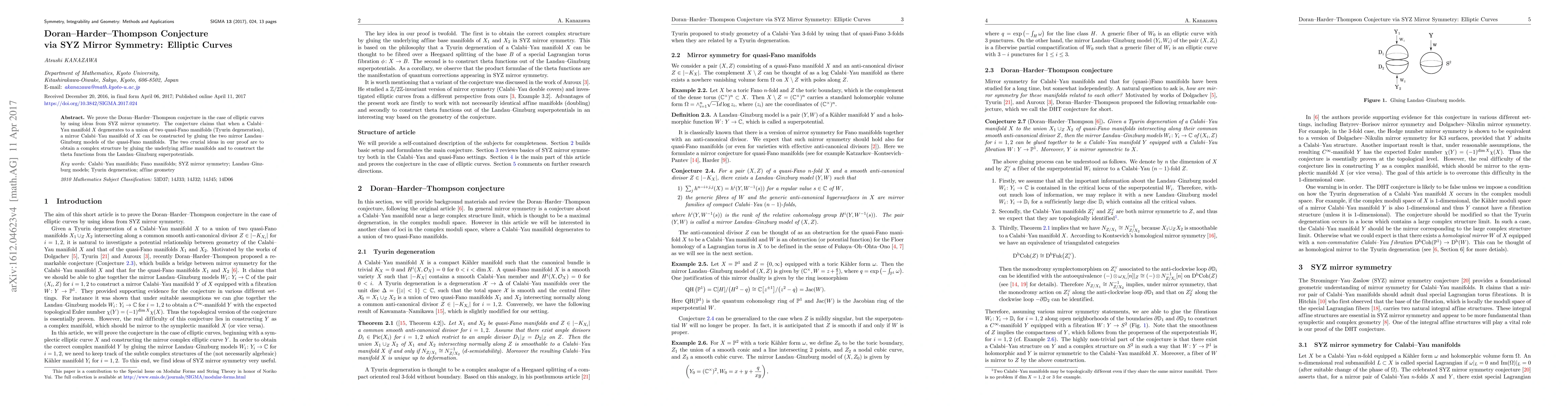 Summary: We prove the Doran-Harder-Thompson conjecture for elliptic curves using SYZ mirror symmetry, establishing that a mirror Calabi-Yau manifold can be constructed by gluing the mirror Landau-Ginzburg models of quasi-Fano manifolds. The key methods involve gluing affine manifolds to obtain a complex structure and constructing theta functions from Landau-Ginzburg superpotentials.