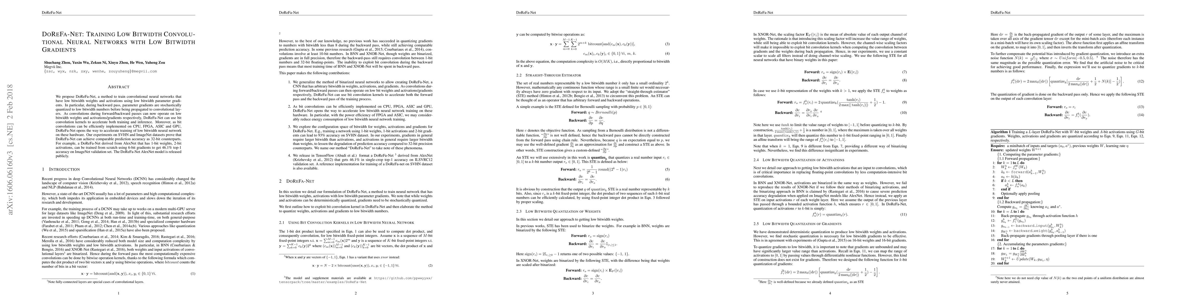 DoReFa-Net proposes a method to train convolutional neural networks with low bitwidth weights and activations using low bitwidth gradients, achieving comparable accuracy to 32-bit models while significantly accelerating both training and inference on various hardware. Experiments demonstrate its effectiveness on SVHN and ImageNet datasets.