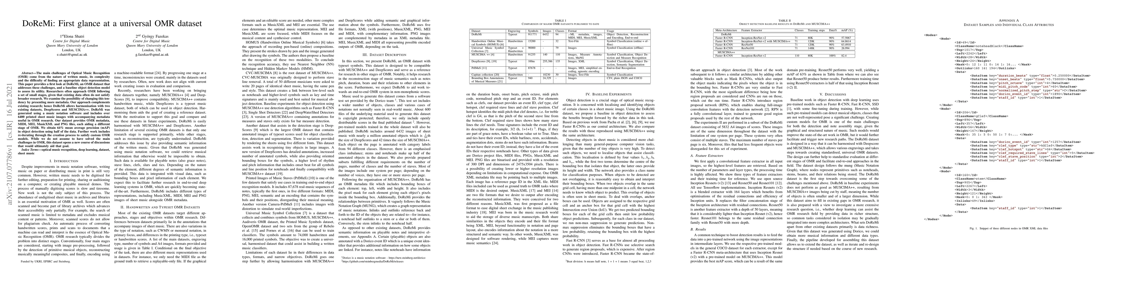 The main challenges of Optical Music Recognition (OMR) come from the nature of written music, its complexity and the difficulty of finding an appropriate data representation. This paper provides a first look at DoReMi, an OMR dataset that addresses these challenges, and a baseline object detection model to assess its utility. Researchers often approach OMR following a set of small stages, given that existing data often do not satisfy broader research. We examine the possibility of changing this tendency by presenting more metadata. Our approach complements existing research; hence DoReMi allows harmonisation with two existing datasets, DeepScores and MUSCIMA++. DoReMi was generated using a music notation software and includes over 6400 printed sheet music images with accompanying metadata useful in OMR research. Our dataset provides OMR metadata, MIDI, MEI, MusicXML and PNG files, each aiding a different stage of OMR. We obtain 64% mean average precision (mAP) in object detection using half of the data. Further work includes re-iterating through the creation process to satisfy custom OMR models. While we do not assume to have solved the main challenges in OMR, this dataset opens a new course of discussions that would ultimately aid that goal.
