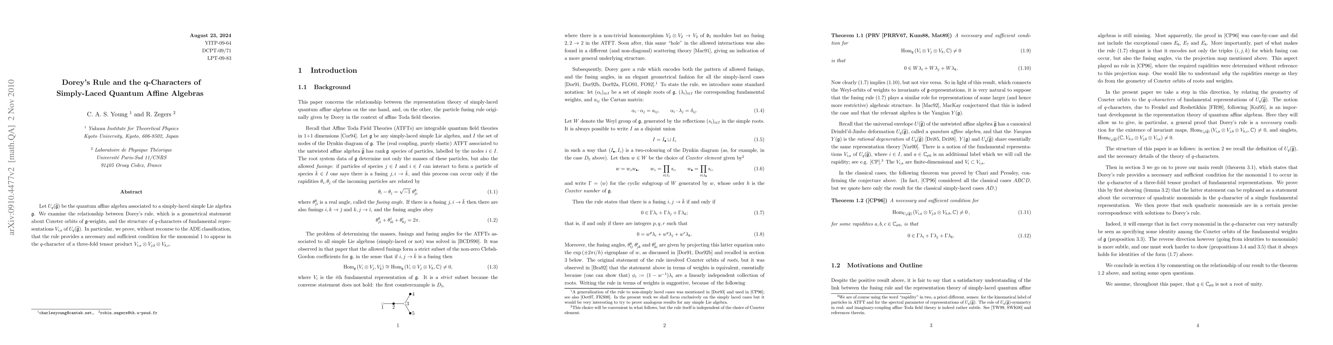 This paper investigates the connection between Dorey's rule, which pertains to Coxeter orbits of g-weights, and the q-characters of fundamental representations in simply-laced quantum affine algebras. The authors prove that Dorey's rule is a necessary and sufficient condition for the monomial 1 to appear in the q-character of a three-fold tensor product of these representations.