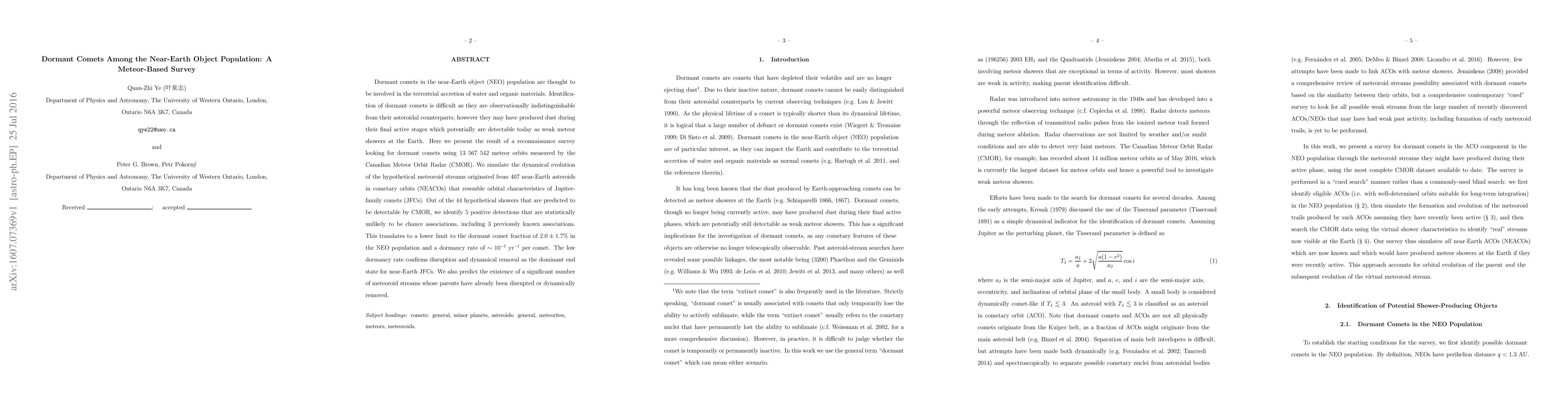 Dormant comets in the near-Earth object (NEO) population are thought to be involved in the terrestrial accretion of water and organic materials. Identification of dormant comets is difficult as they are observationally indistinguishable from their asteroidal counterparts, however they may have produced dust during their final active stages which potentially are detectable today as weak meteor showers at the Earth. Here we present the result of a reconnaissance survey looking for dormant comets using 13~567~542 meteor orbits measured by the Canadian Meteor Orbit Radar (CMOR). We simulate the dynamical evolution of the hypothetical meteoroid streams originated from 407 near-Earth asteroids in cometary orbits (NEACOs) that resemble orbital characteristics of Jupiter-family comets (JFCs). Out of the 44 hypothetical showers that are predicted to be detectable by CMOR, we identify 5 positive detections that are statistically unlikely to be chance associations, including 3 previously known associations. This translates to a lower limit to the dormant comet fraction of $2.0\pm1.7\%$ in the NEO population and a dormancy rate of $\sim 10^{-5}~\mathrm{yr^{-1}}$ per comet. The low dormancy rate confirms disruption and dynamical removal as the dominant end state for near-Earth JFCs. We also predict the existence of a significant number of meteoroid streams whose parents have already been disrupted or dynamically removed.