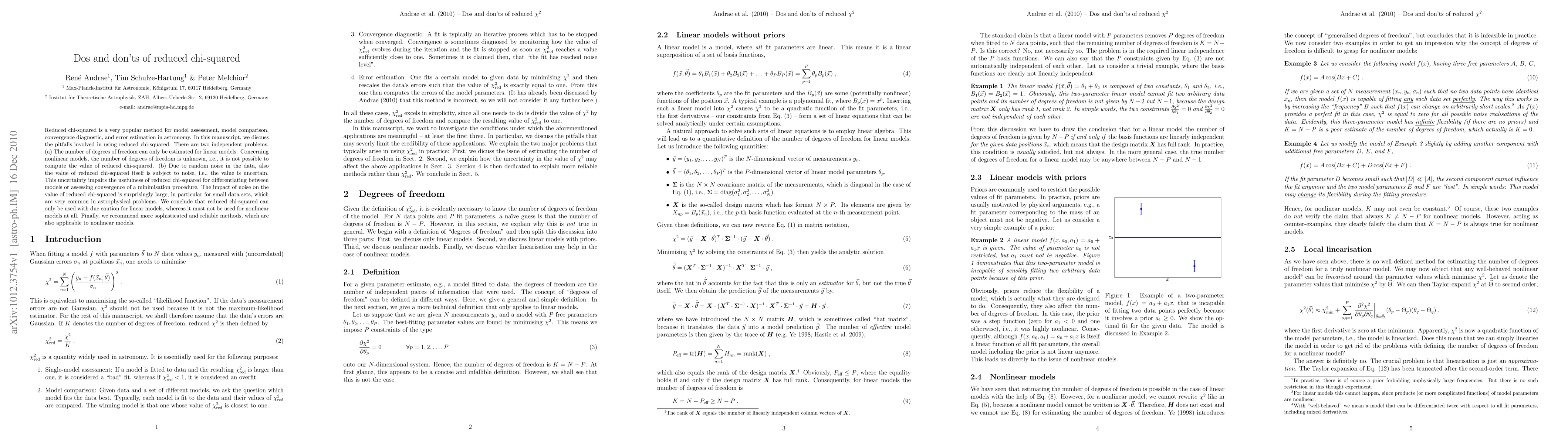 Reduced chi-squared is a very popular method for model assessment, model comparison, convergence diagnostic, and error estimation in astronomy. In this manuscript, we discuss the pitfalls involved in using reduced chi-squared. There are two independent problems: (a) The number of degrees of freedom can only be estimated for linear models. Concerning nonlinear models, the number of degrees of freedom is unknown, i.e., it is not possible to compute the value of reduced chi-squared. (b) Due to random noise in the data, also the value of reduced chi-squared itself is subject to noise, i.e., the value is uncertain. This uncertainty impairs the usefulness of reduced chi-squared for differentiating between models or assessing convergence of a minimisation procedure. The impact of noise on the value of reduced chi-squared is surprisingly large, in particular for small data sets, which are very common in astrophysical problems. We conclude that reduced chi-squared can only be used with due caution for linear models, whereas it must not be used for nonlinear models at all. Finally, we recommend more sophisticated and reliable methods, which are also applicable to nonlinear models.