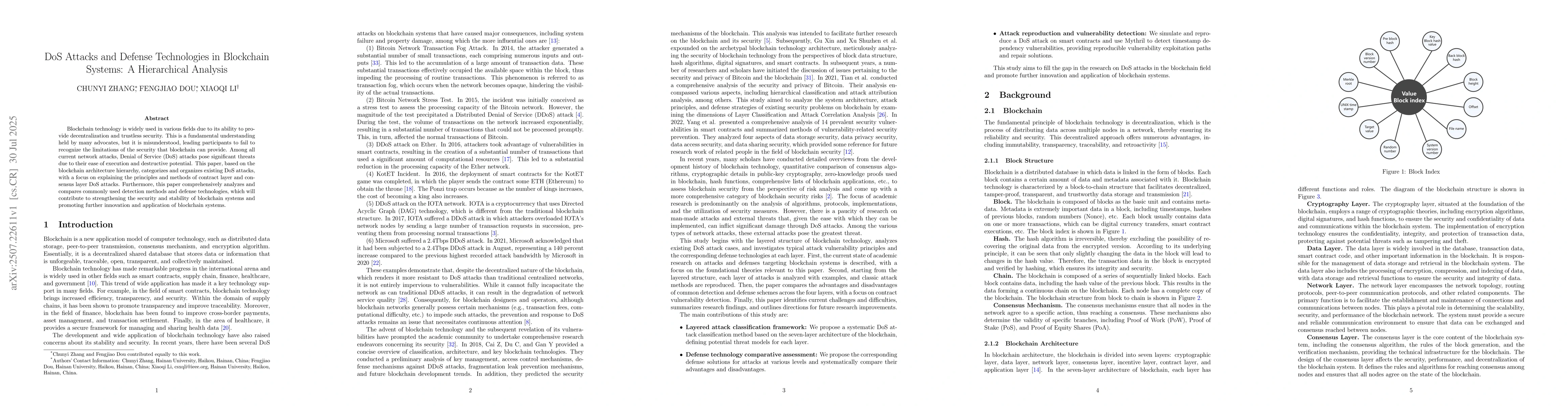 This paper provides a hierarchical analysis of DoS attacks in blockchain systems, categorizing and organizing existing attacks based on the blockchain architecture hierarchy, with a focus on contract and consensus layer attacks.