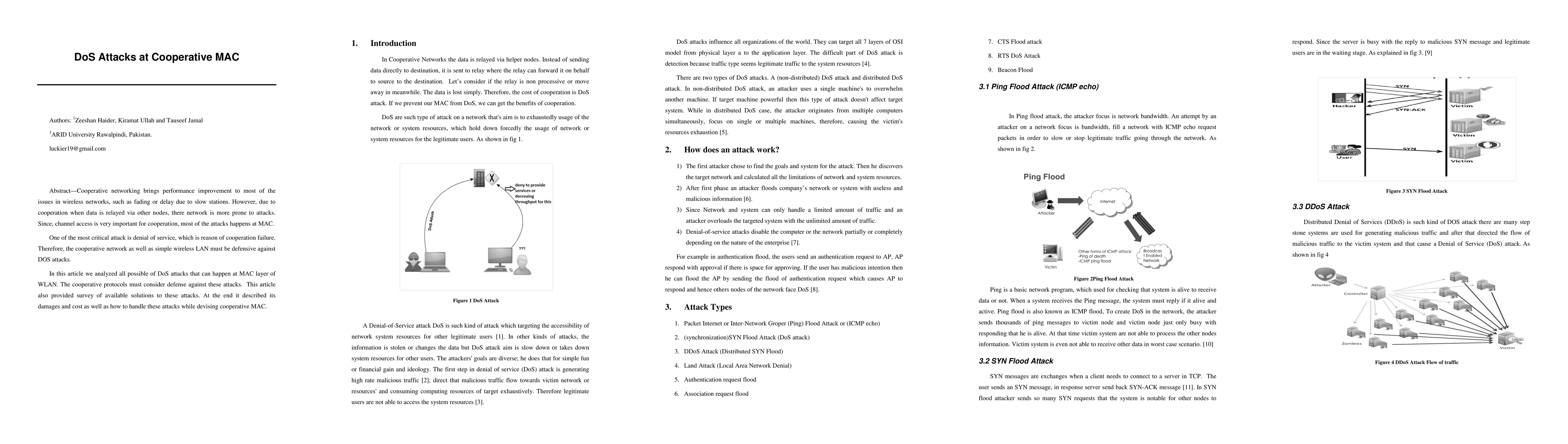 Cooperative networking brings performance improvement to most of the issues in wireless networks, such as fading or delay due to slow stations. However, due to cooperation when data is relayed via other nodes, there network is more prone to attacks. Since, channel access is very important for cooperation, most of the attacks happens at MAC. One of the most critical attack is denial of service, which is reason of cooperation failure. Therefore, the cooperative network as well as simple wireless LAN must be defensive against DOS attacks. In this article we analyzed all possible of DoS attacks that can happen at MAC layer of WLAN. The cooperative protocols must consider defense against these attacks. This article also provided survey of available solutions to these attacks. At the end it described its damages and cost as well as how to handle these attacks while devising cooperative MAC.
