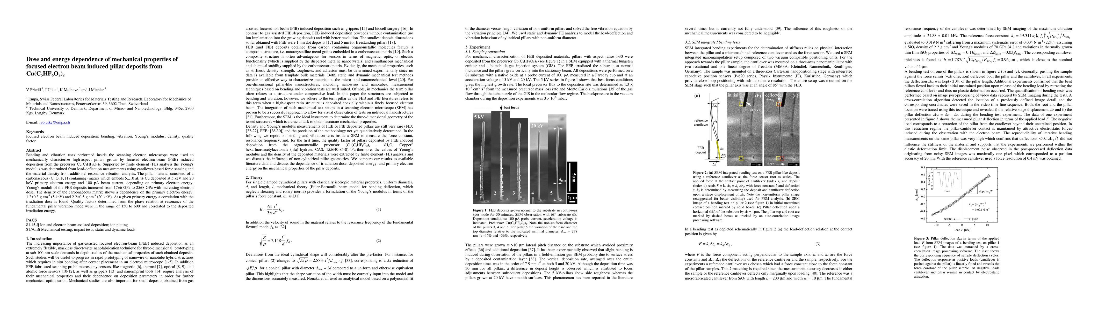 Researchers studied the mechanical properties of pillars grown using focused electron beam induced deposition from a copper precursor, finding that increasing electron dose increases Young's modulus and density of the carbonaceous matrix, with quality factors correlated to deposited energy.