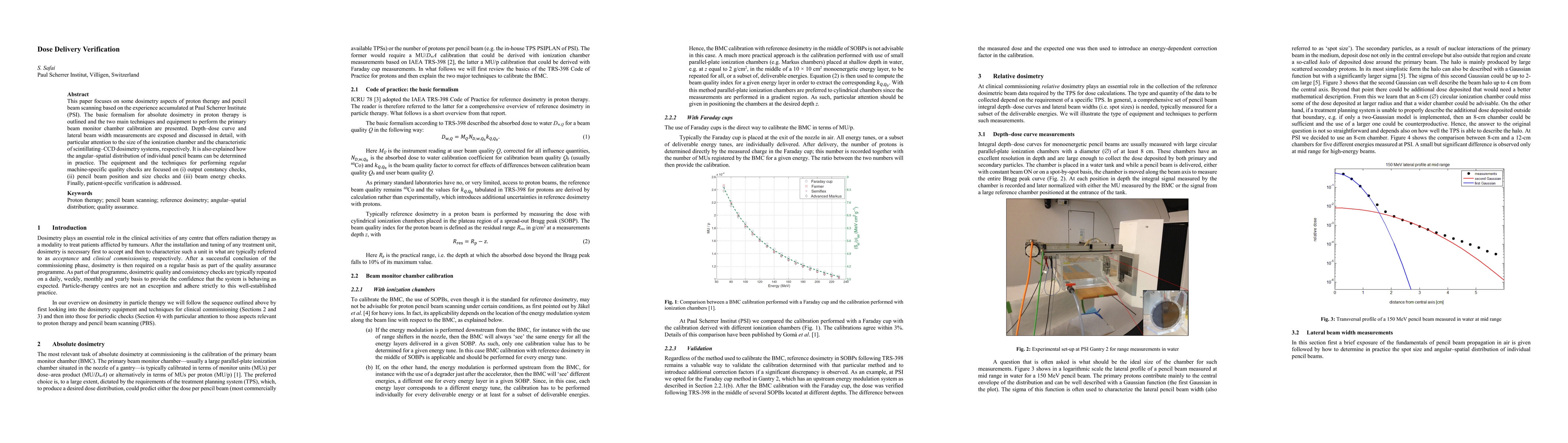 This paper focuses on some dosimetry aspects of proton therapy and pencil beam scanning based on the experience accumulated at Paul Scherrer Institute(PSI). The basic formalism for absolute dosimetry in proton therapy is outlined and the two main techniques and equipment to perform the primary beam monitor chamber calibration are presented. Depth-dose curve and lateral beam width measurements are exposed and discussed in detail, with particular attention to the size of the ionization chamber and the characteristic of scintillating-CCD dosimetry systems, respectively. It is also explained how the angular-spatial distribution of individual pencil beams can be determined in practice. The equipment and the techniques for performing regularmachine-specific quality checks are focused on (i)output constancy checks, (ii)pencil beam position and size checks and (iii)beam energy checks. Finally, patient-specific verification is addressed.