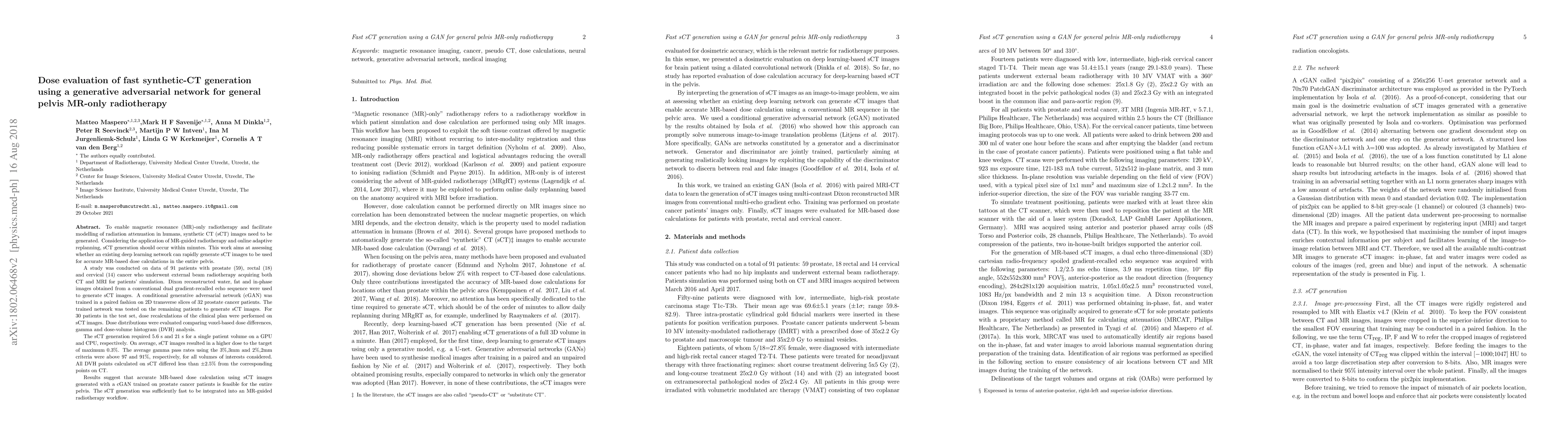 To enable magnetic resonance (MR)-only radiotherapy and facilitate modelling of radiation attenuation in humans, synthetic-CT (sCT) images need to be generated. Considering the application of MR-guided radiotherapy and online adaptive replanning, sCT generation should occur within minutes. This work aims at assessing whether an existing deep learning network can rapidly generate sCT images to be used for accurate MR-based dose calculations in the entire pelvis. A study was conducted on data of 91 patients with prostate, rectal and cervical cancer who underwent external beam radiotherapy acquiring both CT and MRI for patients' simulation. Dixon reconstructed water, fat and in-phase images obtained from a conventional dual gradient-recalled echo sequence were used to generate sCT images. A conditional generative adversarial network (cGAN) was trained in a paired fashion on 2D transverse slices of 32 prostate cancer patients. The trained network was tested on the remaining patients to generate sCT images. For 30 patients in the test set, dose recalculations of the clinical plan were performed on sCT images. Dose distributions were evaluated comparing voxel-based dose differences, gamma and dose-volume histogram (DVH) analysis. The sCT generation required 5.6 s and 21 s for a single patient volume on a GPU and CPU, respectively. On average, sCT images resulted in a higher dose to the target of maximum 0.3%. Results suggest that accurate MR-based dose calculation using sCT images generated with a cGAN trained on prostate cancer patients is feasible for the entire pelvis. The sCT generation was sufficiently fast to be integrated into an MR-guided radiotherapy workflow.