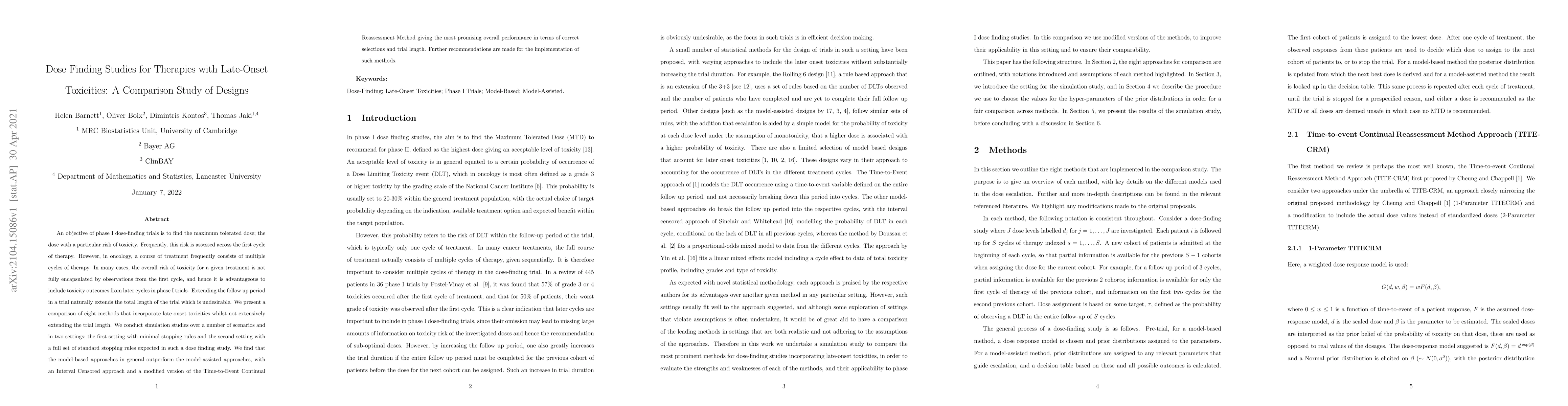 This paper compares eight dose-finding trial designs that account for late-onset toxicities without excessively lengthening trials. Model-based approaches generally outperform model-assisted ones, with the Interval Censored approach and a modified Time-to-Event Continual Reassessment Method showing the best overall performance in simulations.