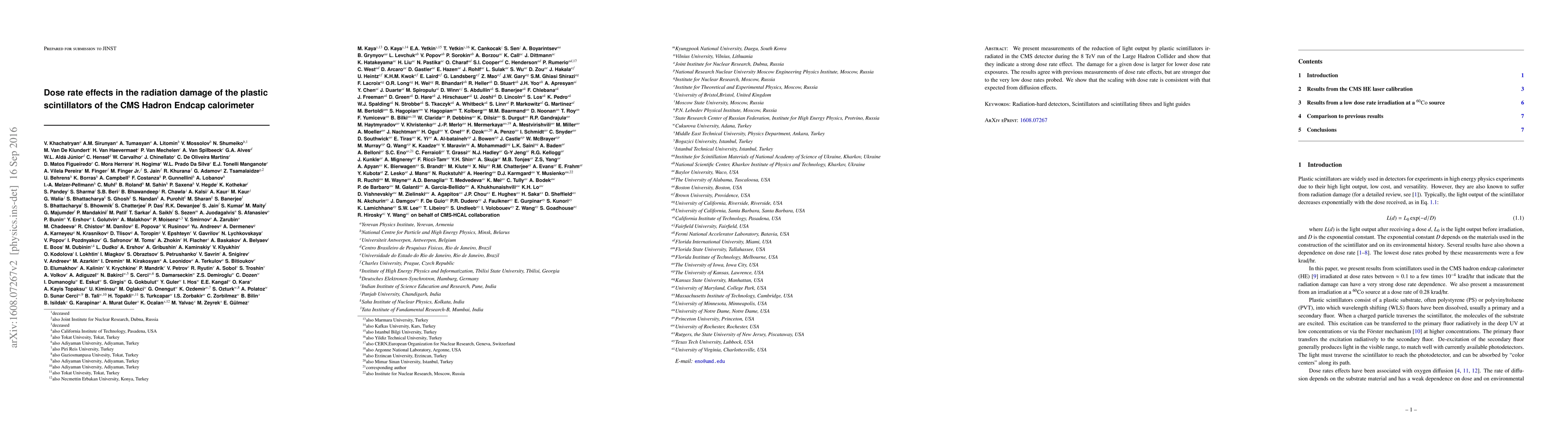 This paper investigates the radiation damage in plastic scintillators used in the CMS Hadron Endcap Calorimeter, revealing a significant dose rate effect where lower dose rates cause more damage for the same total dose. The findings align with previous studies but highlight stronger effects due to the low dose rates examined, consistent with diffusion-based damage mechanisms.