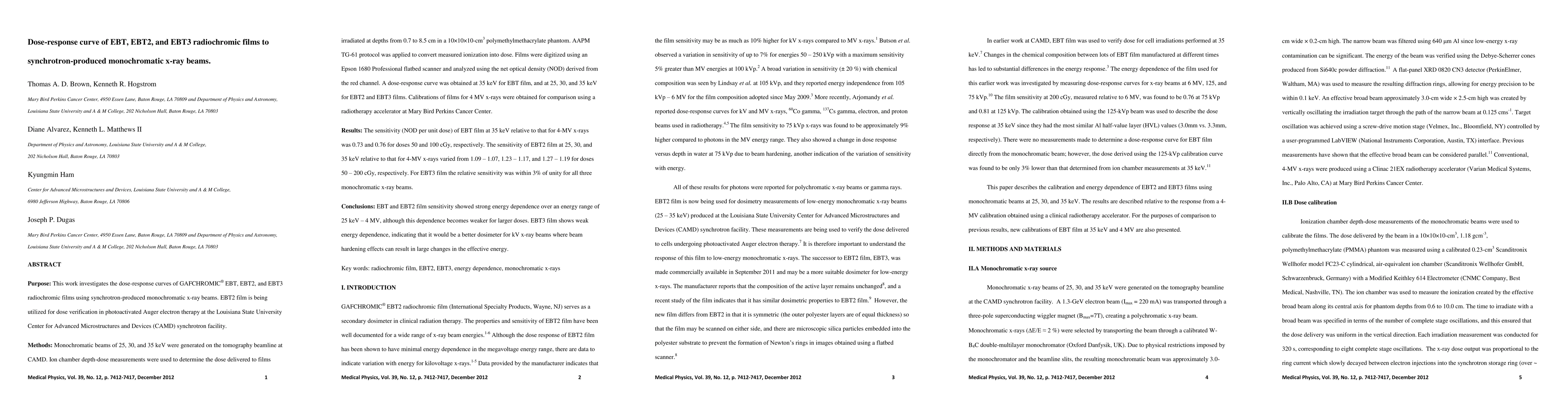 This study evaluates the dose-response curves of EBT, EBT2, and EBT3 radiochromic films using synchrotron-produced monochromatic x-rays, finding EBT3 to exhibit minimal energy dependence, making it a superior dosimeter for kV x-ray beams compared to EBT and EBT2.