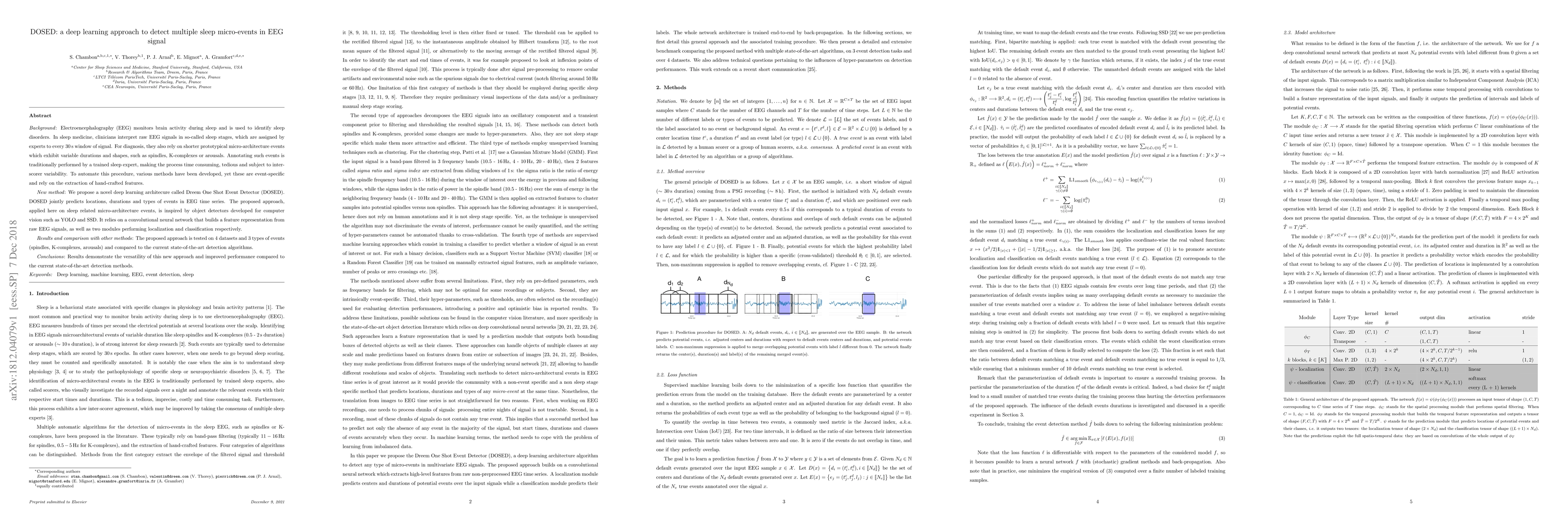 The paper introduces DOSED, a deep learning architecture for detecting multiple sleep micro-events in EEG signals, showing improved performance compared to existing methods. The proposed approach, inspired by computer vision object detectors, jointly predicts event locations, durations, and types in raw EEG data.