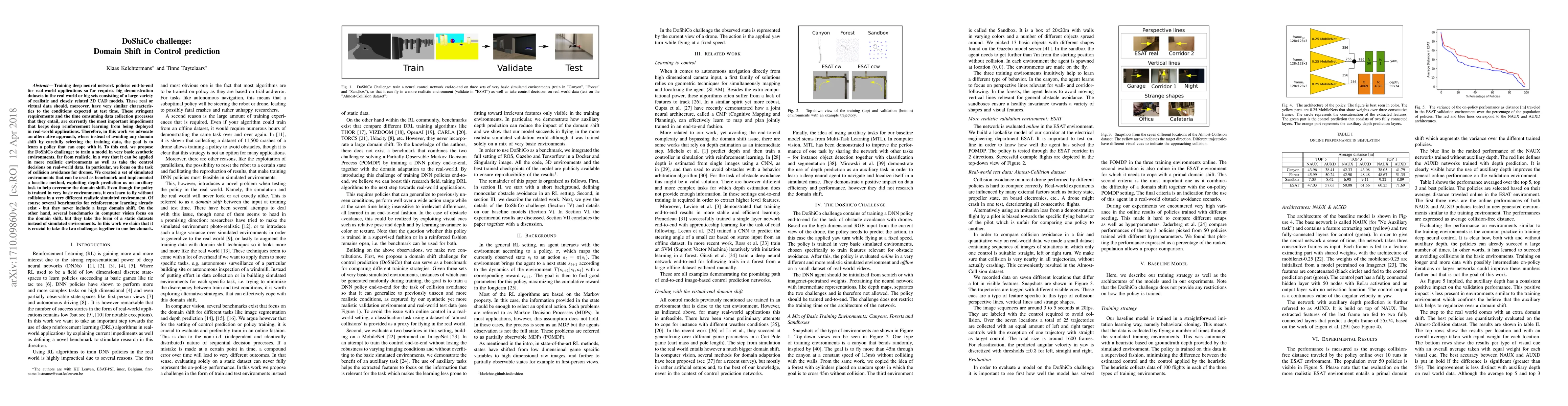 Training deep neural network policies end-to-end for real-world applications so far requires big demonstration datasets in the real world or big sets consisting of a large variety of realistic and closely related 3D CAD models. These real or virtual data should, moreover, have very similar characteristics to the conditions expected at test time. These stringent requirements and the time consuming data collection processes that they entail, are currently the most important impediment that keeps deep reinforcement learning from being deployed in real-world applications. Therefore, in this work we advocate an alternative approach, where instead of avoiding any domain shift by carefully selecting the training data, the goal is to learn a policy that can cope with it. To this end, we propose the DoShiCo challenge: to train a model in very basic synthetic environments, far from realistic, in a way that it can be applied in more realistic environments as well as take the control decisions on real-world data. In particular, we focus on the task of collision avoidance for drones. We created a set of simulated environments that can be used as benchmark and implemented a baseline method, exploiting depth prediction as an auxiliary task to help overcome the domain shift. Even though the policy is trained in very basic environments, it can learn to fly without collisions in a very different realistic simulated environment. Of course several benchmarks for reinforcement learning already exist - but they never include a large domain shift. On the other hand, several benchmarks in computer vision focus on the domain shift, but they take the form of a static datasets instead of simulated environments. In this work we claim that it is crucial to take the two challenges together in one benchmark.