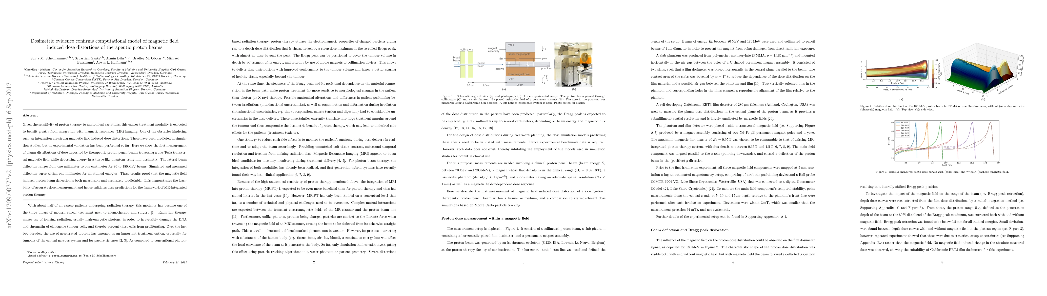 This study confirms computational models predicting magnetic field-induced dose distortions in proton beams, showing measurable deflections in a one-Tesla magnetic field using film dosimetry. The agreement between simulated and measured deflections validates the feasibility of accurate dose measurement in MR-integrated proton therapy.