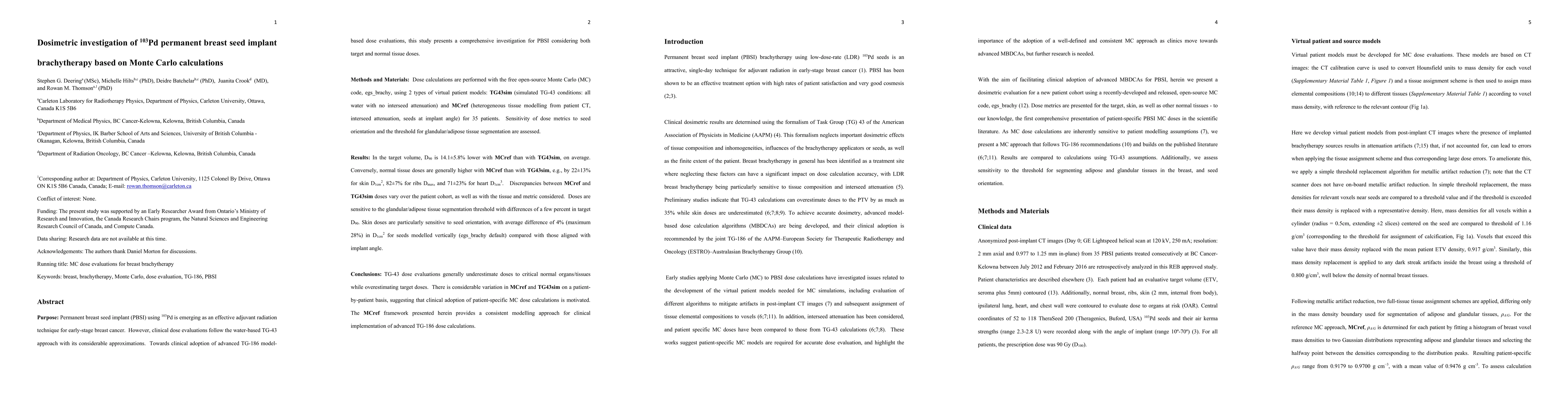 PURPOSE: Permanent breast seed implant (PBSI) using 103Pd is emerging as an effective adjuvant radiation technique for early-stage breast cancer. However, clinical dose evaluations follow the water-based TG-43 approach with its considerable approximations. Towards clinical adoption of advanced TG-186 model-based dose evaluations, this study presents a comprehensive investigation for PBSI considering both target and normal tissue doses. METHODS: Dose calculations are performed with the free open-source Monte Carlo (MC) code, egs_brachy, using 2 types of virtual patient models: TG43sim (simulated TG-43 conditions: all water with no interseed attenuation) and MCref (heterogeneous tissue modelling from patient CT, interseed attenuation, seeds at implant angle) for 35 patients. Sensitivity of dose metrics to seed orientation and the threshold for glandular/adipose tissue segmentation are assessed. RESULTS: In the target volume, D90 is 14.1% lower with MCref than with TG43sim, on average. Conversely, normal tissue doses are generally higher with MCref than with TG43sim, e.g., by 22% for skin D1cm2, 82% for ribs Dmax, and 71% for heart D1cm3. Discrepancies between MCref and TG43sim doses vary over the patient cohort, as well as with the tissue and metric considered. Doses are sensitive to the glandular/adipose tissue segmentation threshold with differences of a few percent in target D90. Skin doses are sensitive to seed orientation. CONCLUSIONS: TG-43 dose evaluations generally underestimate doses to critical normal organs/tissues while overestimating target doses. There is considerable variation in MCref and TG43sim on a patient-by-patient basis, suggesting that clinical adoption of patient-specific MC dose calculations is motivated. The MCref framework presented herein provides a consistent modelling approach for clinical implementation of advanced TG-186 dose calculations.
