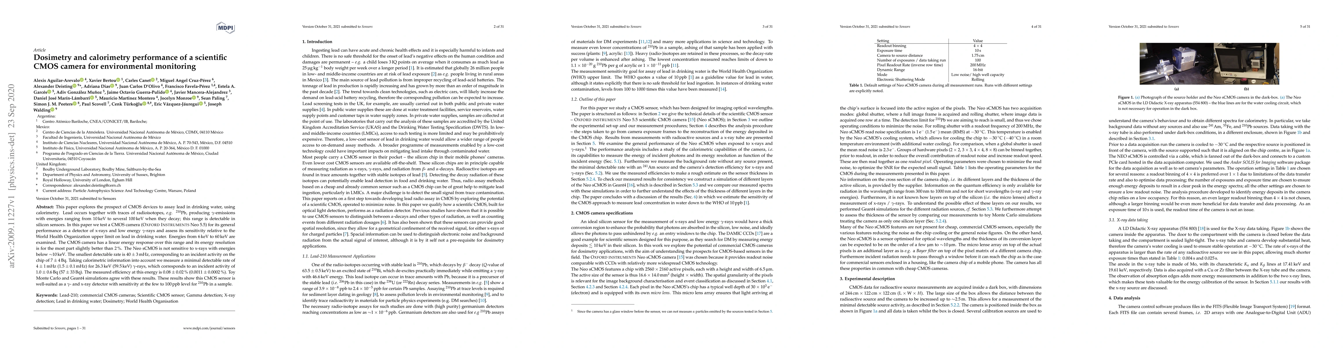This paper explores the prospect of CMOS devices to assay lead in drinking water, using calorimetry. Lead occurs together with traces of radioisotopes, e.g. Lead-210, producing $\gamma$-emissions with energies ranging from 10 keV to several 100 keV when they decay; this range is detectable in silicon sensors. In this paper we test a CMOS camera (Oxford Instruments Neo 5.5) for its general performance as a detector of x-rays and low energy $\gamma$-rays and assess its sensitivity relative to the World Health Organization upper limit on lead in drinking water. Energies from 6 keV to 60 keV are examined. The CMOS camera has a linear energy response over this range and its energy resolution is for the most part slightly better than 2 %. The Neo sCMOS is not sensitive to x-rays with energies below $\sim\!\!10 keV$. The smallest detectable rate is 40$\pm$3 mHz, corresponding to an incident activity on the chip of 7$\pm$4 Bq. The estimation of the incident activity sensitivity from the detected activity relies on geometric acceptance and the measured efficiency vs. energy. We report the efficiency measurement, which is 0.08$\pm$0.02 % (0.0011$\pm$0.0002 %) at 26.3 keV (59.5 keV). Taking calorimetric information into account we measure a minimal detectable rate of 4$\pm$1 mHz (1.5$\pm$0.1 mHz) for 26.3 keV (59.5 keV) $\gamma$-rays, which corresponds to an incident activity of 1.0$\pm$0.6 Bq (57$\pm$33 Bq). Toy Monte Carlo and Geant4 simulations agree with these results. These results show this CMOS sensor is well-suited as a $\gamma$- and x-ray detector with sensitivity at the few to 100 ppb level for Lead-210 in a sample.