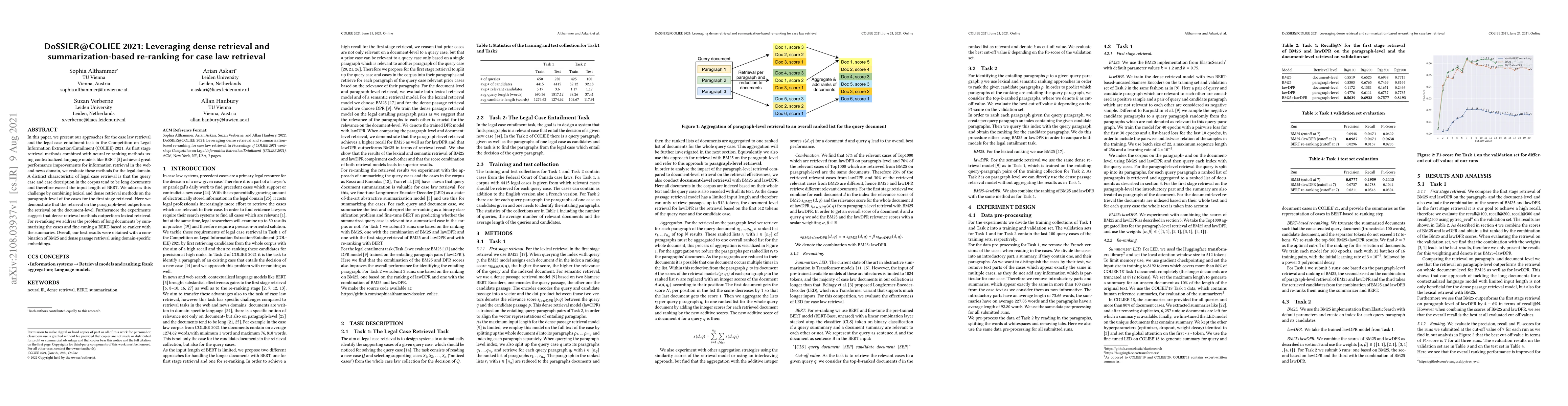 The paper proposes combining dense retrieval and summarization-based re-ranking to improve case law retrieval, addressing the challenge of long legal documents exceeding BERT's input length. Experiments show paragraph-level dense retrieval outperforms document-level retrieval, and fine-tuning a BERT-based re-ranker with summaries yields the best results.