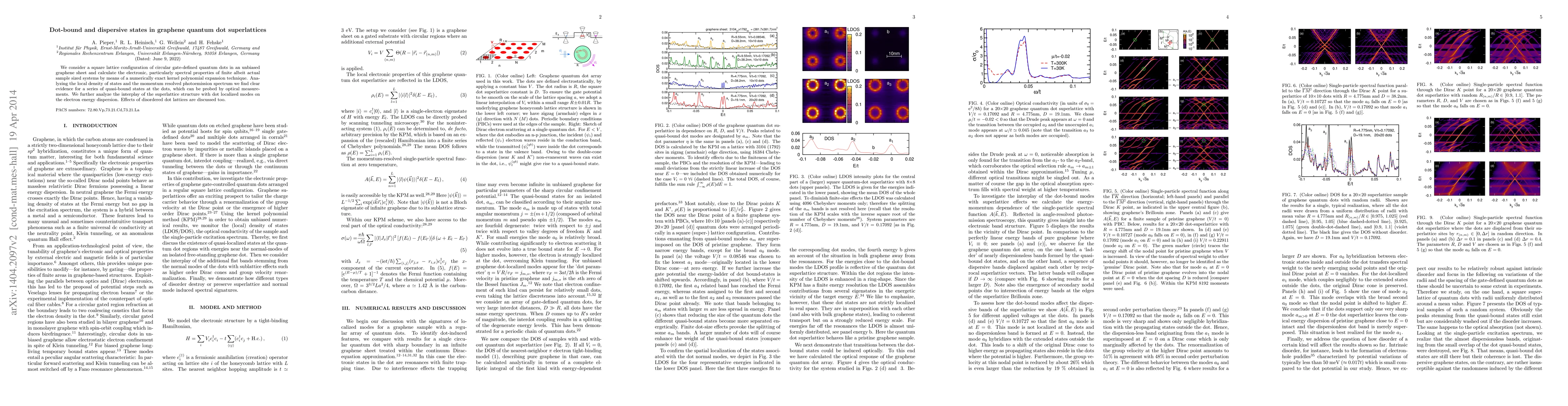 We consider a square lattice configuration of circular gate-defined quantum dots in an unbiased graphene sheet and calculate the electronic, particularly spectral properties of finite albeit actual sample sized systems by means of a numerically exact kernel polynomial expansion technique. Analyzing the local density of states and the momentum resolved photoemission spectrum we find clear evidence for a series of quasi-bound states at the dots, which can be probed by optical measurements. We further analyze the interplay of the superlattice structure with dot localized modes on the electron energy dispersion. Effects of disordered dot lattices are discussed too.