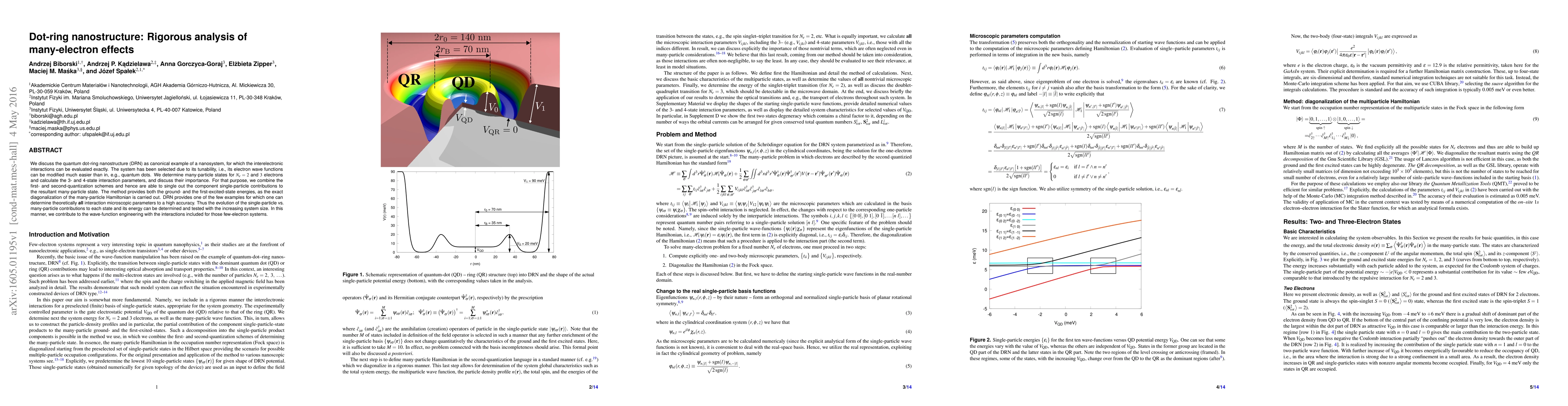 The paper presents a method for exact diagonalization of the many-particle Hamiltonian for quantum dot-ring nanostructures, determining all relevant interaction parameters and their evolution with tuning parameters.