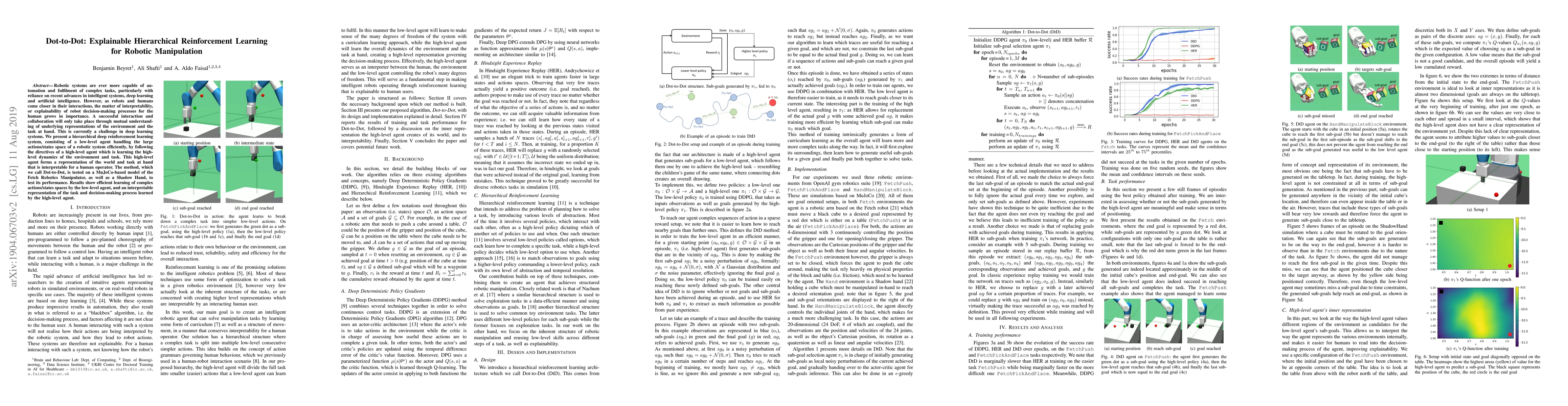 This paper introduces Dot-to-Dot, a hierarchical reinforcement learning system for robotic manipulation that enhances interpretability. It employs a low-level agent for efficient handling of large action/state spaces and a high-level agent that learns interpretable representations of the environment and task, enabling better human-robot collaboration.