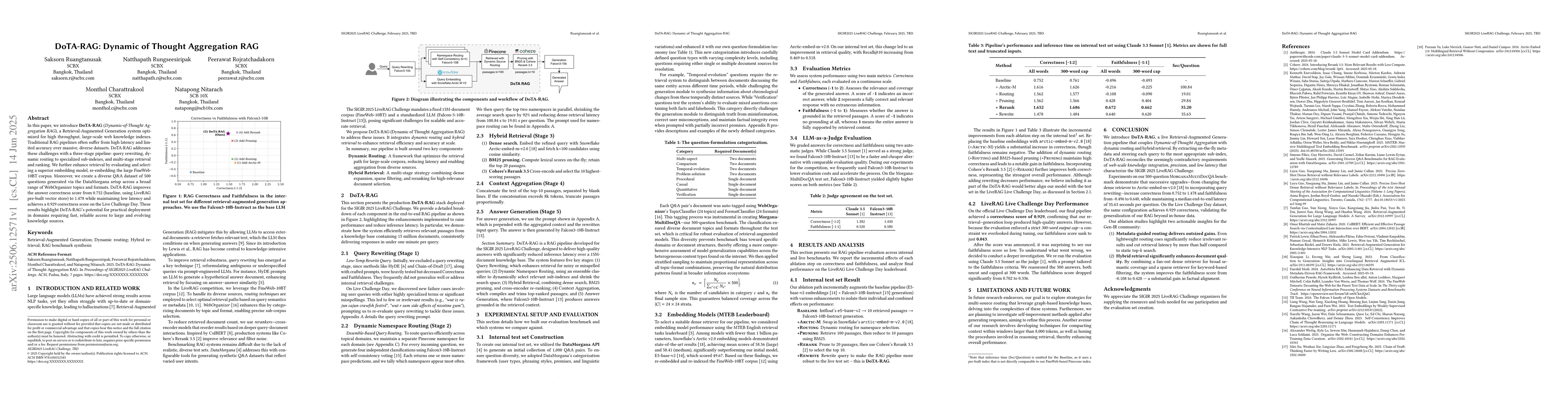 In this paper, we introduce DoTA-RAG (Dynamic-of-Thought Aggregation RAG), a retrieval-augmented generation system optimized for high-throughput, large-scale web knowledge indexes. Traditional RAG pipelines often suffer from high latency and limited accuracy over massive, diverse datasets. DoTA-RAG addresses these challenges with a three-stage pipeline: query rewriting, dynamic routing to specialized sub-indexes, and multi-stage retrieval and ranking. We further enhance retrieval by evaluating and selecting a superior embedding model, re-embedding the large FineWeb-10BT corpus. Moreover, we create a diverse Q&A dataset of 500 questions generated via the DataMorgana setup across a broad range of WebOrganizer topics and formats. DoTA-RAG improves the answer correctness score from 0.752 (baseline, using LiveRAG pre-built vector store) to 1.478 while maintaining low latency, and it achieves a 0.929 correctness score on the Live Challenge Day. These results highlight DoTA-RAG's potential for practical deployment in domains requiring fast, reliable access to large and evolving knowledge sources.