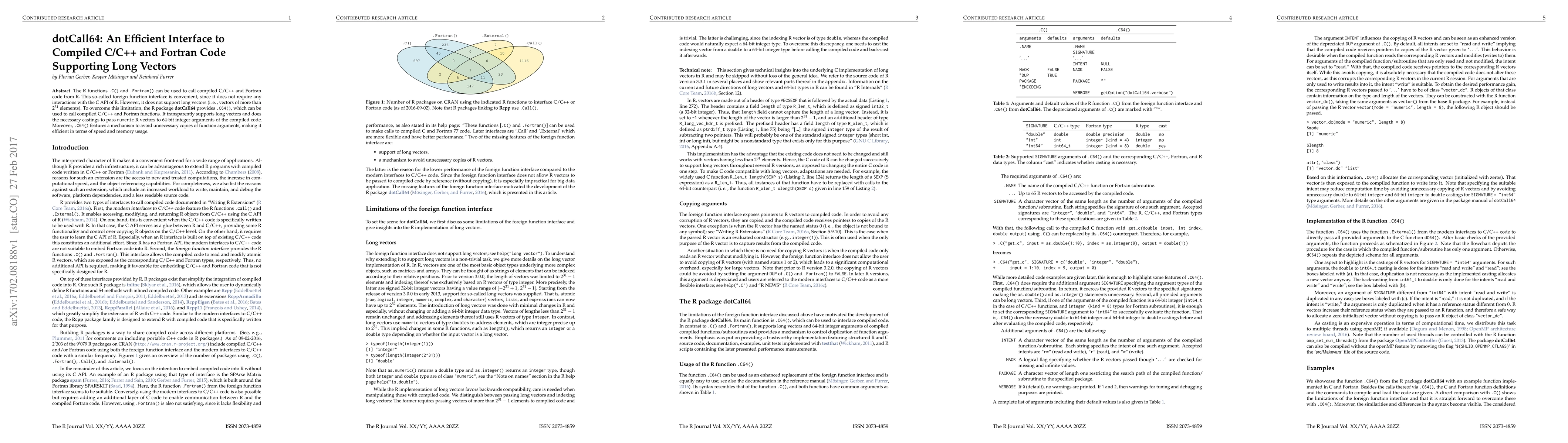 The R package dotCall64 extends the foreign function interface to support long vectors in compiled C/C++ and Fortran code by introducing .C64(), which efficiently handles large data sets and avoids unnecessary copies of function arguments.
