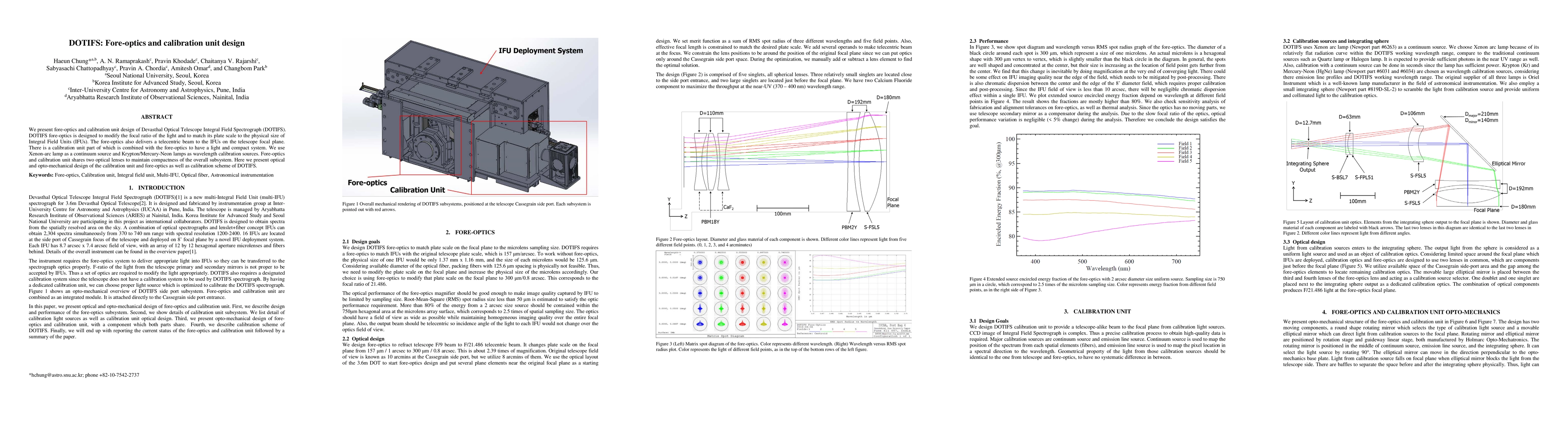 We present fore-optics and calibration unit design of Devasthal Optical Telescope Integral Field Spectrograph (DOTIFS). DOTIFS fore-optics is designed to modify the focal ratio of the light and to match its plate scale to the physical size of Integral Field Units (IFUs). The fore-optics also delivers a telecentric beam to the IFUs on the telescope focal plane. There is a calibration unit part of which is combined with the fore-optics to have a light and compact system. We use Xenon-arc lamp as a continuum source and Krypton/Mercury-Neon lamps as wavelength calibration sources. Fore-optics and calibration unit shares two optical lenses to maintain compactness of the overall subsystem. Here we present optical and opto-mechanical design of the calibration unit and fore-optics as well as calibration scheme of DOTIFS.