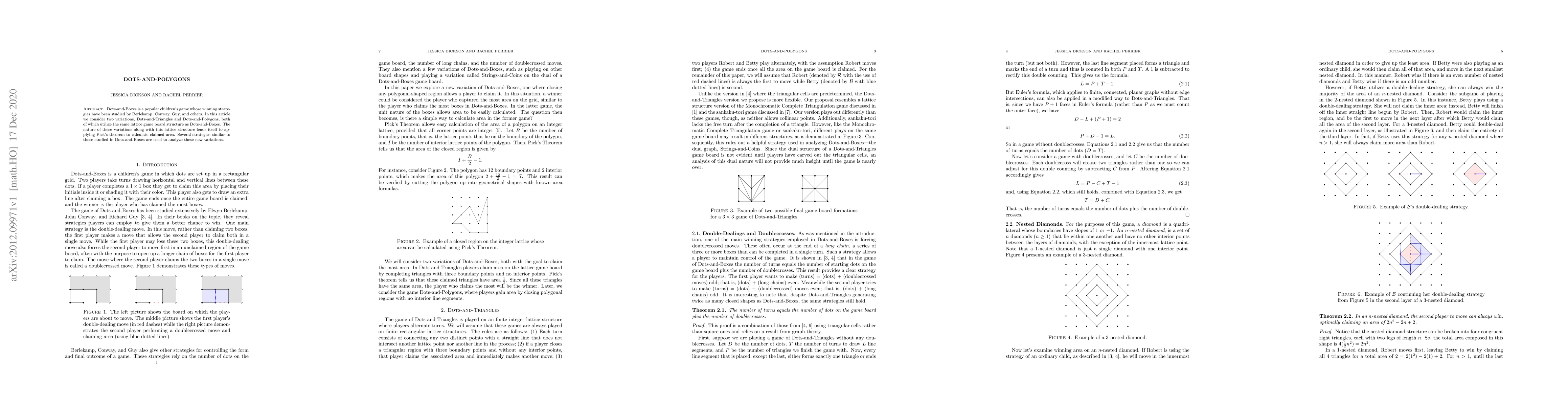 This paper analyzes two variations of Dots-and-Boxes, Dots-and-Triangles and Dots-and-Polygons, using Pick's theorem to calculate area and similar strategies studied in Dots-and-Boxes.